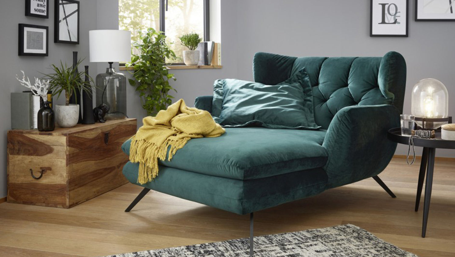 El acolchado del KAWOLA CHARME es de espuma PUR e impresiona por su suave y desenfadado confort de asiento. Por supuesto, el asiento largo está completamente tapizado con la tela verde esmeralda, de modo que este estupendo sofá reclinable también puede colocarse libremente en la habitación. Si no busca simplemente un sillón largo, sino un punto culminante muy especial, ¡el puf KAWOLA CHARME es la elección perfecta!