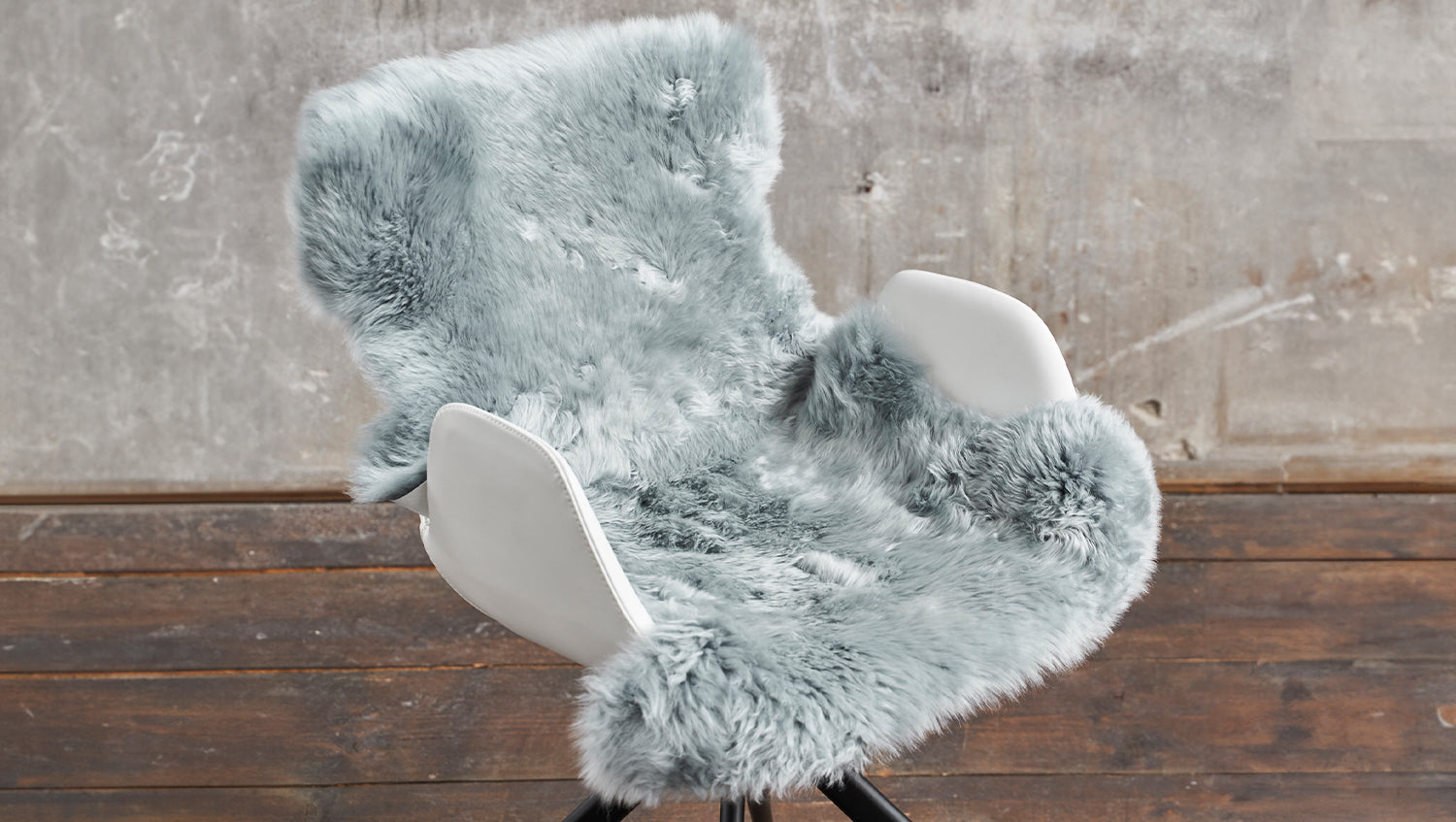 La piel KAWOLA CALEBRE de 95 cm en color platino llama la atención y combina a la perfección con las sillas de nuestra tienda. Las sillas blancas son especialmente adecuadas, ya que resaltan la belleza y el color de la piel. Nuestro consejo: también combina a la perfección con las pieles SALERA.