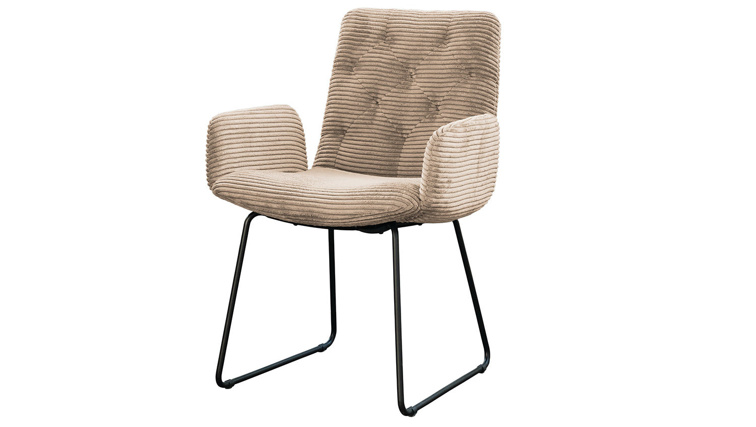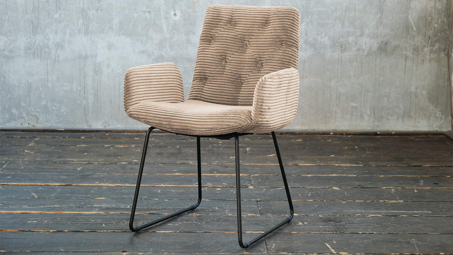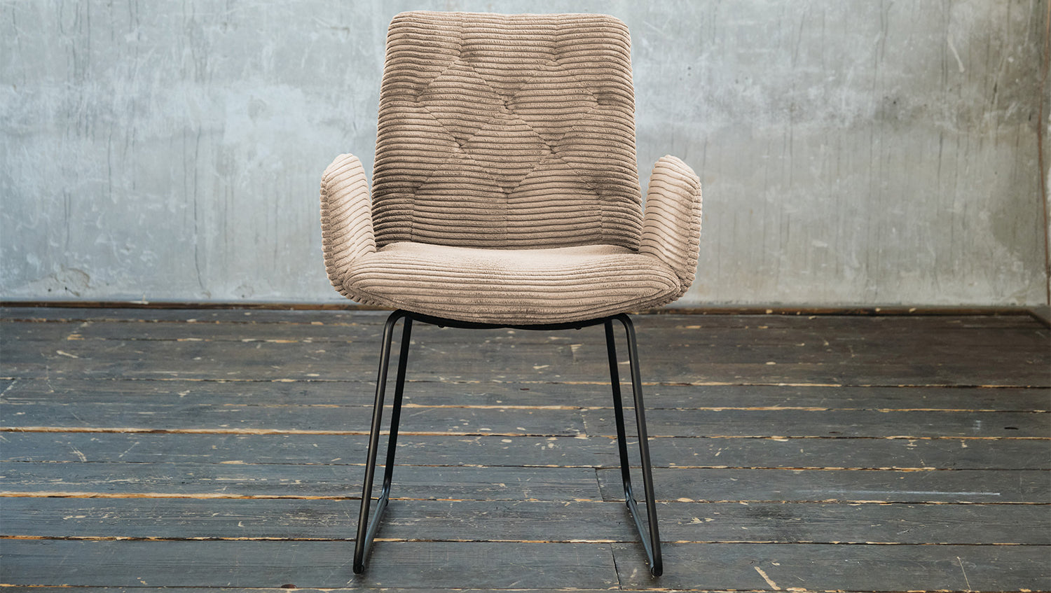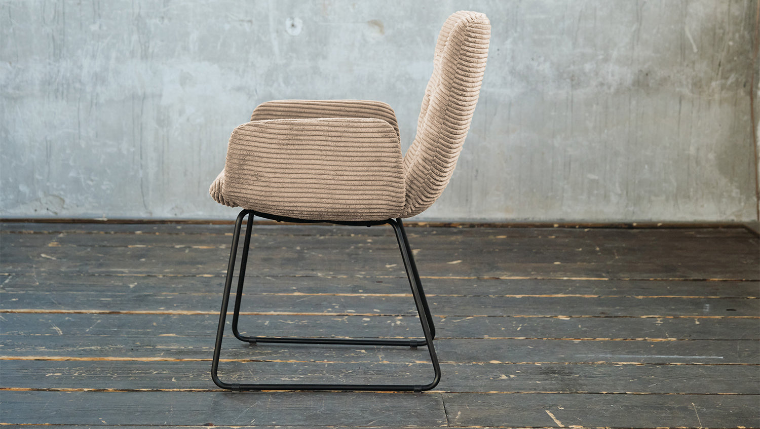 La silla de comedor KAWOLA NEW CHARME no es sólo un mueble, sino un auténtico elemento de diseño que pone un nuevo acento en su hogar. El estilo de la serie NEW CHARME es una reminiscencia de los años sesenta: el respaldo está cosido de forma elaborada sin botones; el respaldo está ligeramente curvado hacia delante en ambos lados y recuerda la forma de una silla de ala; los pies de patín de metal están recubiertos de polvo. La forma inusual de la silla NEW CHARME se complementa con la tapicería en la moderna tela de pana. Si lo que busca no es sólo una silla de comedor, sino una silla atemporal que marque tendencia, la serie NEW CHARME de KAWOLA es la elección perfecta.