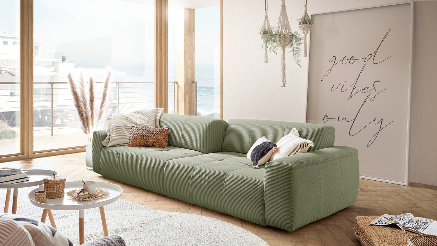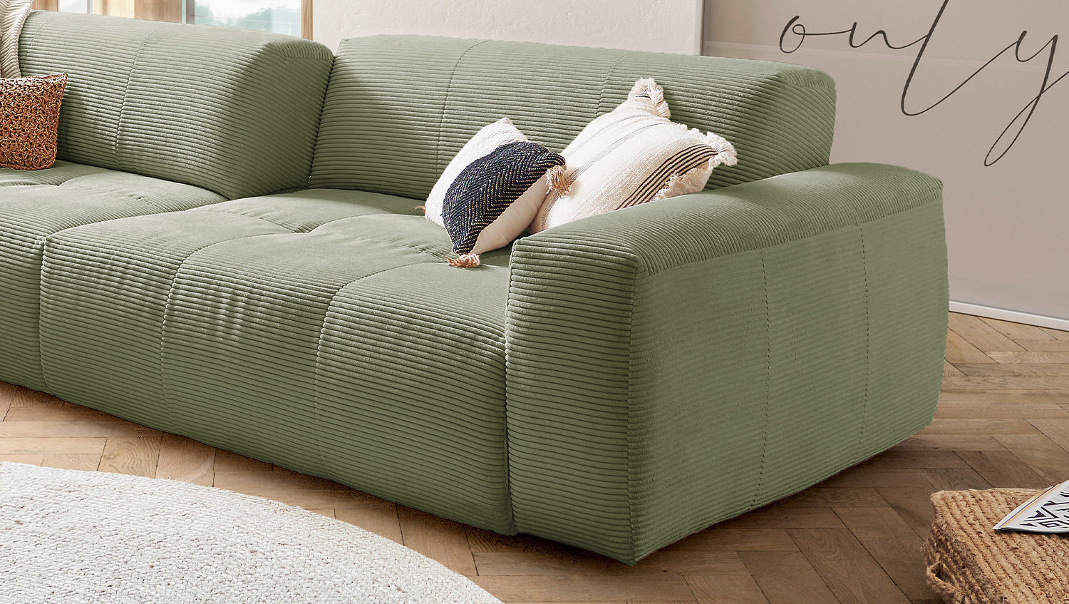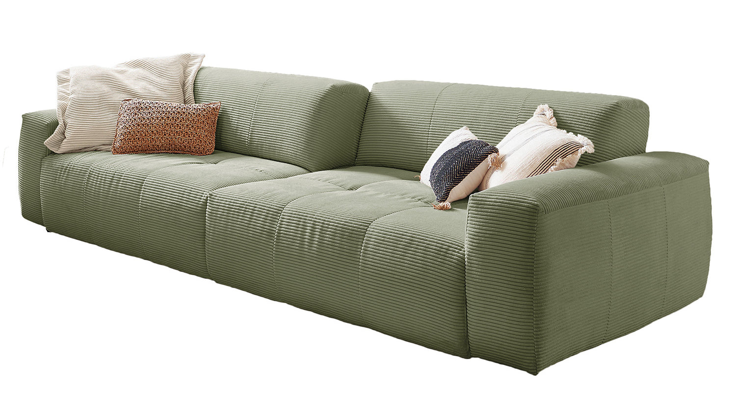 KAWOLA Sofá extra ancho PALACE 3 plazas con ajuste de la profundidad del asiento Pana verde oliva