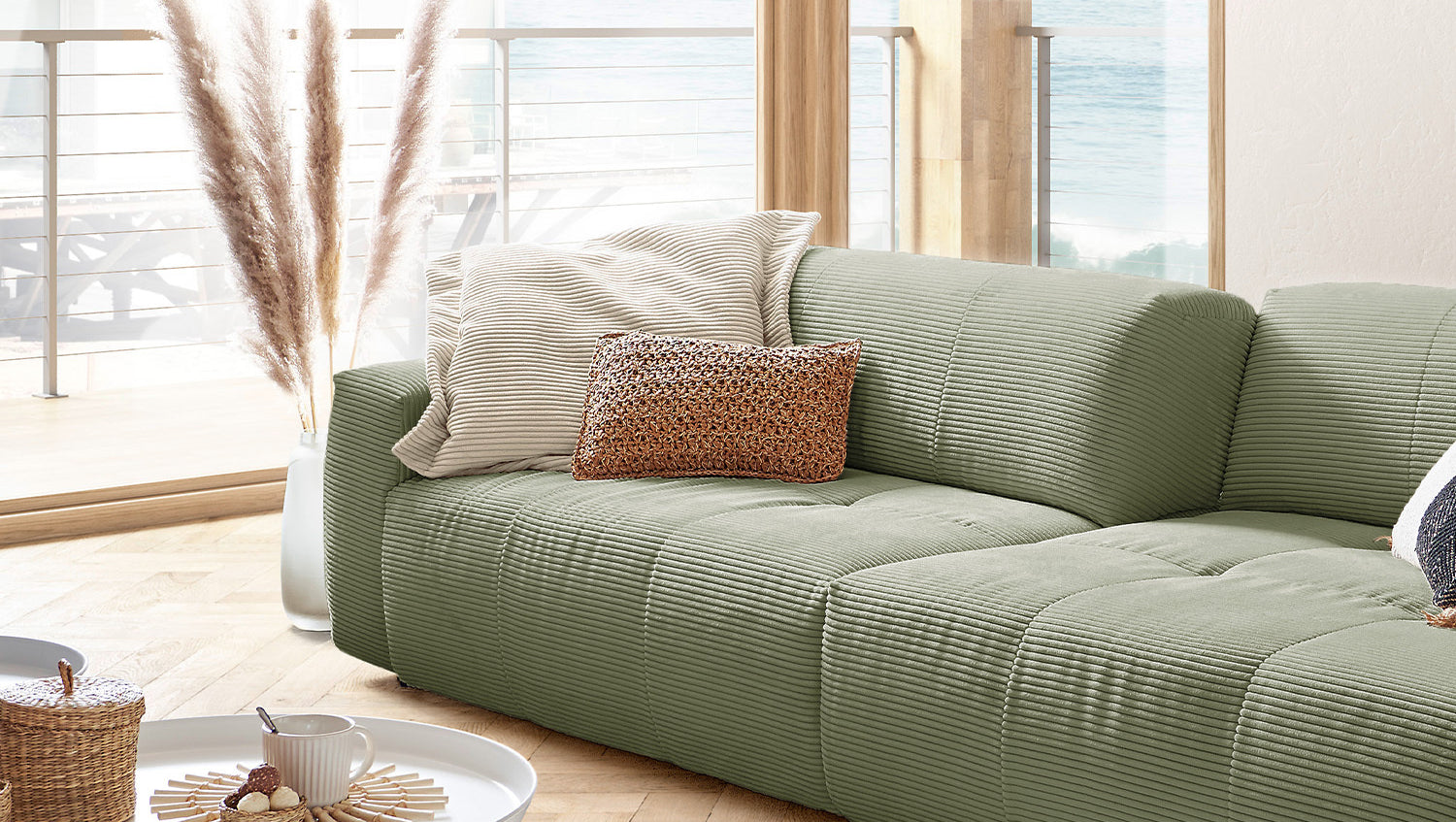 El sofá PALACE impresiona por su elegancia atemporal, su diseño moderno y su confort especialmente elevado. La moderna funda de pana es extrasuave y cubre la acogedora superficie reclinable, cuyo desenfadado tapizado invita a relajarse y descansar. El extra especial: el sofá PALACE puede transformarse de un Sofá extra ancho en un asiento clásico en un abrir y cerrar de ojos. Gracias a la regulación de la profundidad del asiento, que se consigue ajustando el respaldo, la profundidad del asiento puede reducirse de 83 cm a 59 cm. Esto le permite decidir si prefiere una posición sentada más erguida o si prefiere tener espacio para estirarse. Nota: Cuando son nuevas, las fundas muestran un pronunciado patrón ondulado, que es intencionado debido al diseño, el modelo y la construcción. La tapicería se adaptará a la forma del cuerpo y la firmeza del asiento disminuirá ligeramente. Las ligeras diferencias en la firmeza del asiento de los grupos complementarios se deben al diseño y, por tanto, no son motivo de queja.