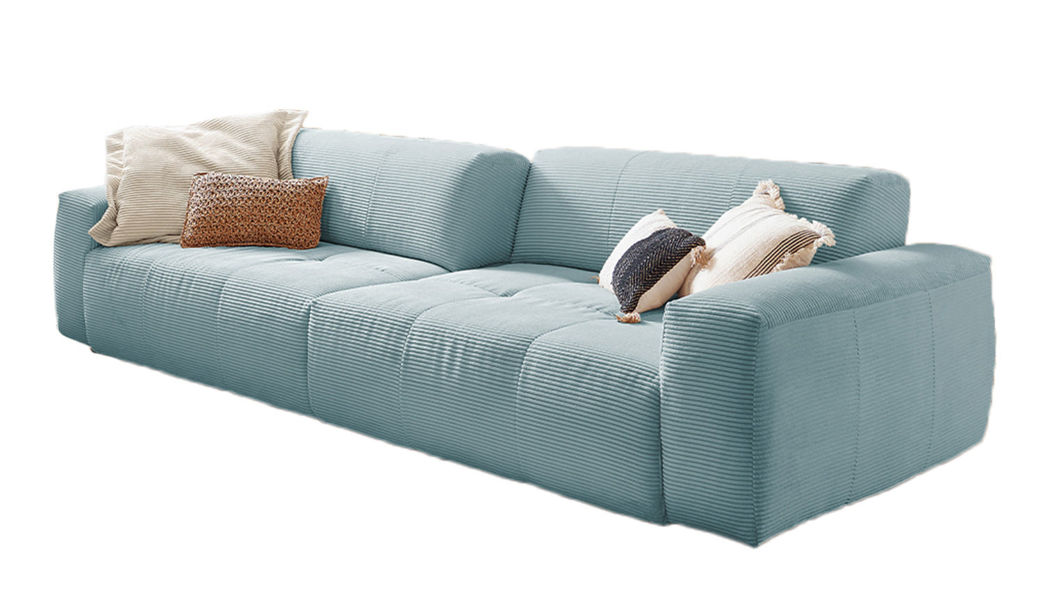 KAWOLA Sofá extra ancho PALACE 3 plazas con ajuste de la profundidad del asiento Pana azul claro