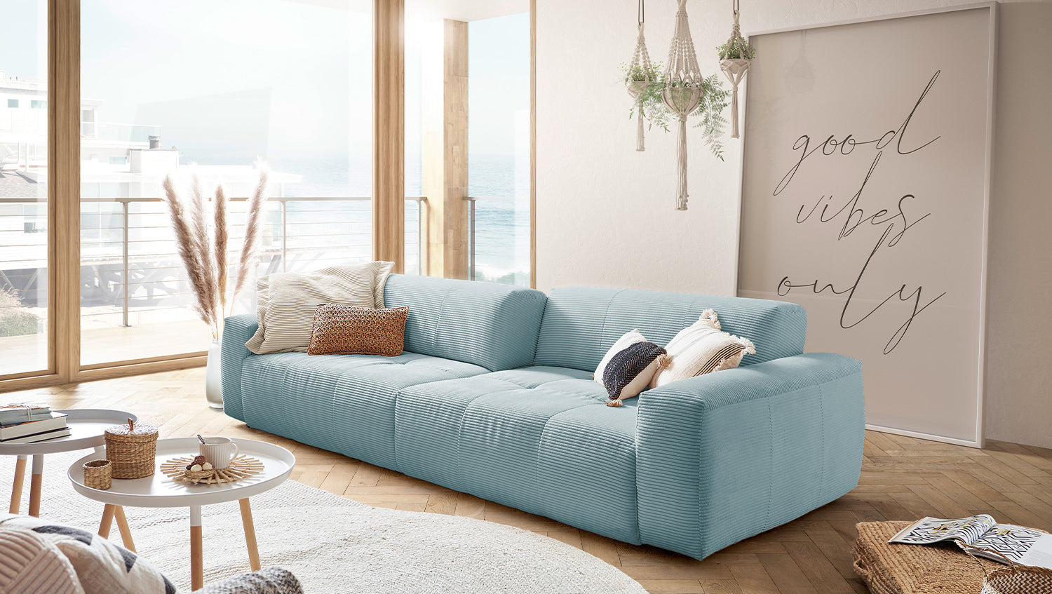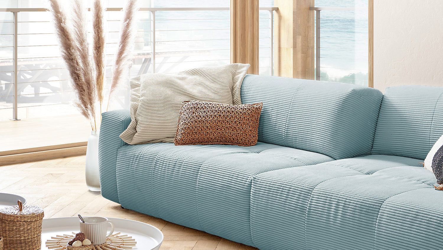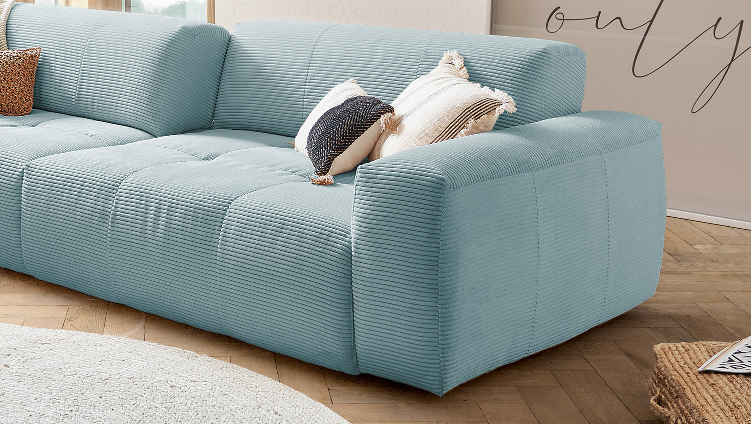 El sofá PALACE impresiona por su elegancia atemporal, su diseño moderno y su confort especialmente elevado. La moderna funda de pana es extrasuave y cubre la acogedora superficie reclinable, cuyo desenfadado tapizado invita a relajarse y descansar. El extra especial: el sofá PALACE puede transformarse de un Sofá extra ancho en un asiento clásico en un abrir y cerrar de ojos. Gracias a la regulación de la profundidad del asiento, que se consigue ajustando el respaldo, la profundidad del asiento puede reducirse de 83 cm a 59 cm. Esto le permite decidir si prefiere una posición sentada más erguida o si prefiere tener espacio para estirarse. Nota: Cuando son nuevas, las fundas muestran un pronunciado patrón ondulado, que es intencionado debido al diseño, el modelo y la construcción. La tapicería se adaptará a la forma del cuerpo y la firmeza del asiento disminuirá ligeramente. Las ligeras diferencias en la firmeza del asiento de los grupos complementarios se deben al diseño y, por tanto, no son motivo de queja.