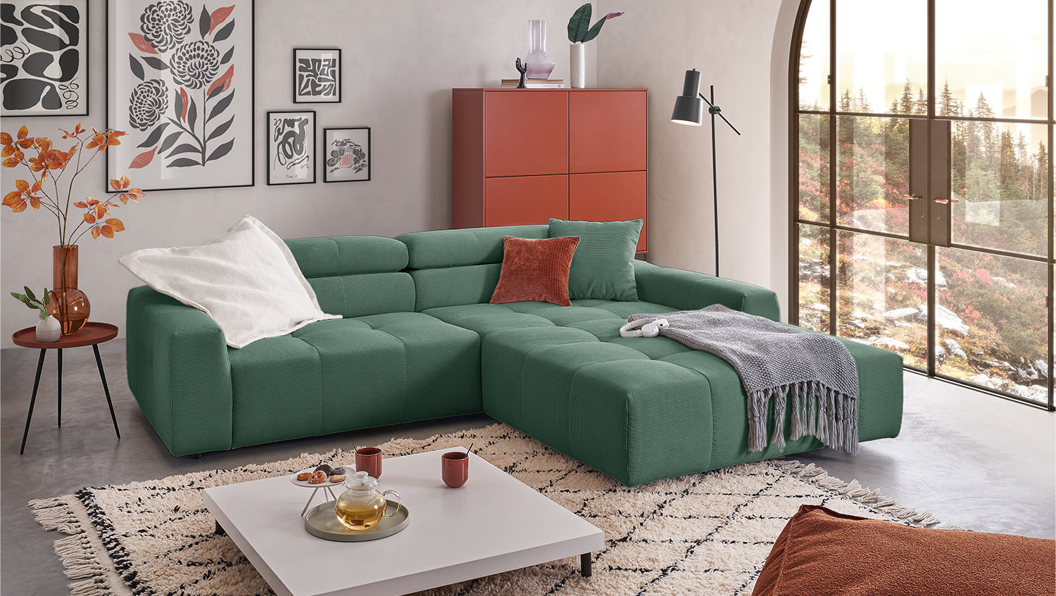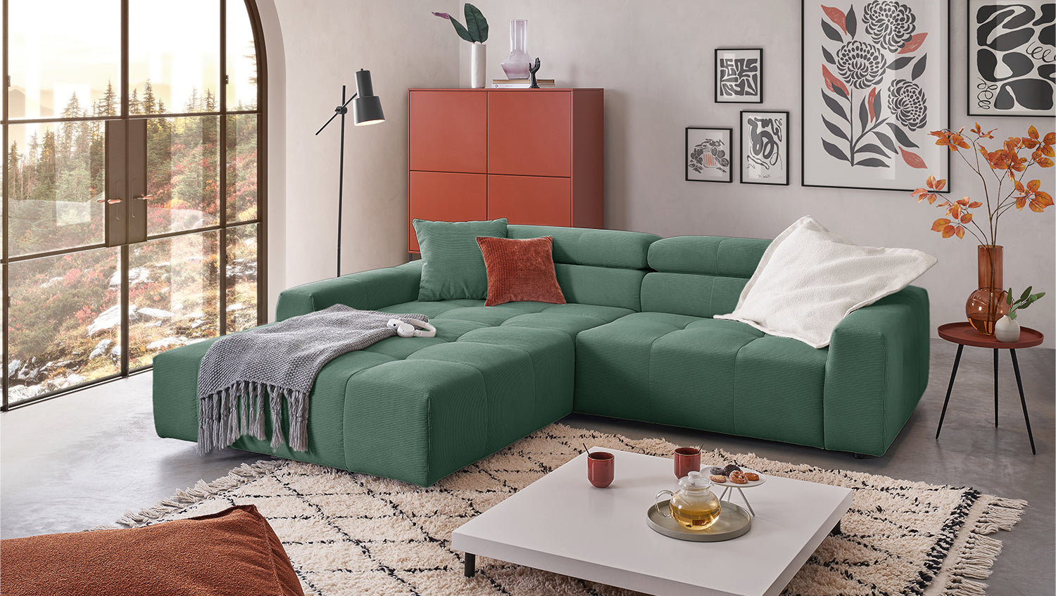KAWOLA Sofá RENO Sofá esquinero Pana fina verde