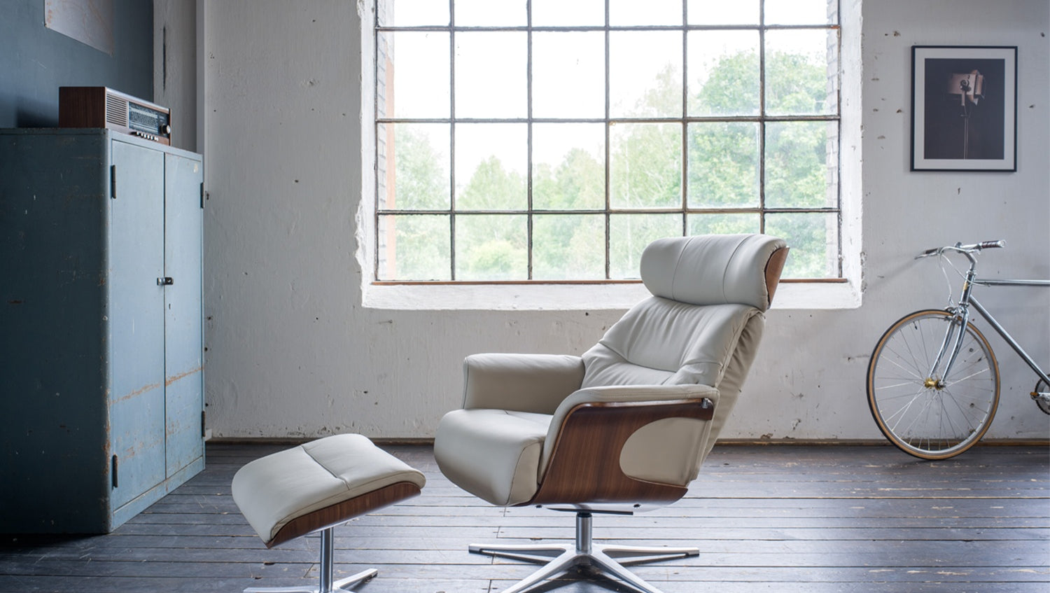 KAWOLA sillón TOSAR reclinable giratorio cuero gris con Puf