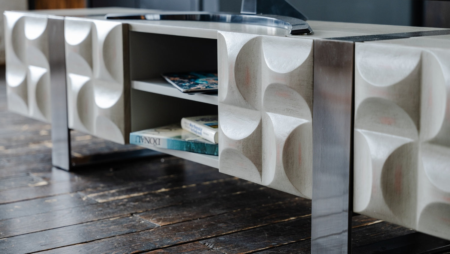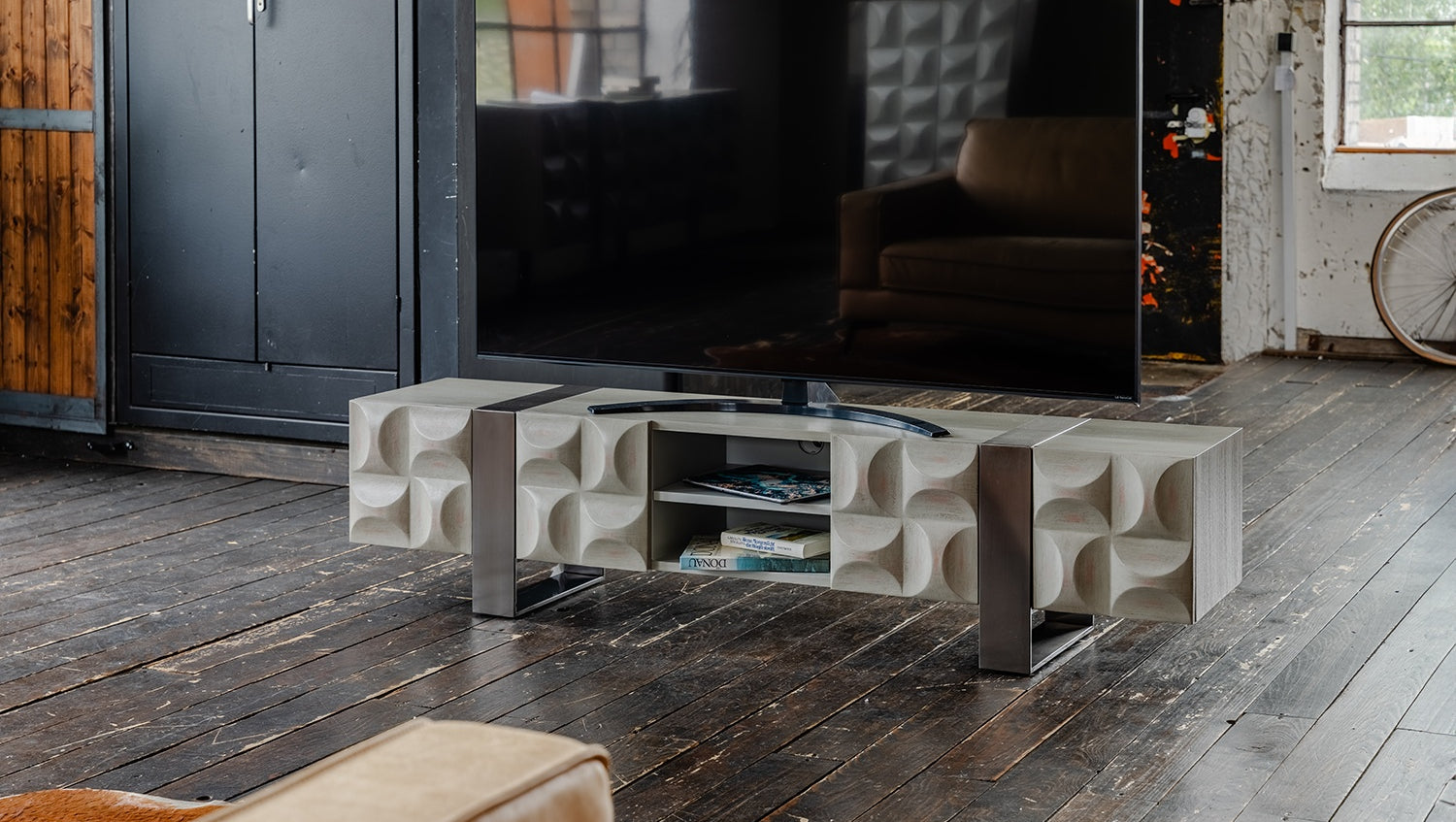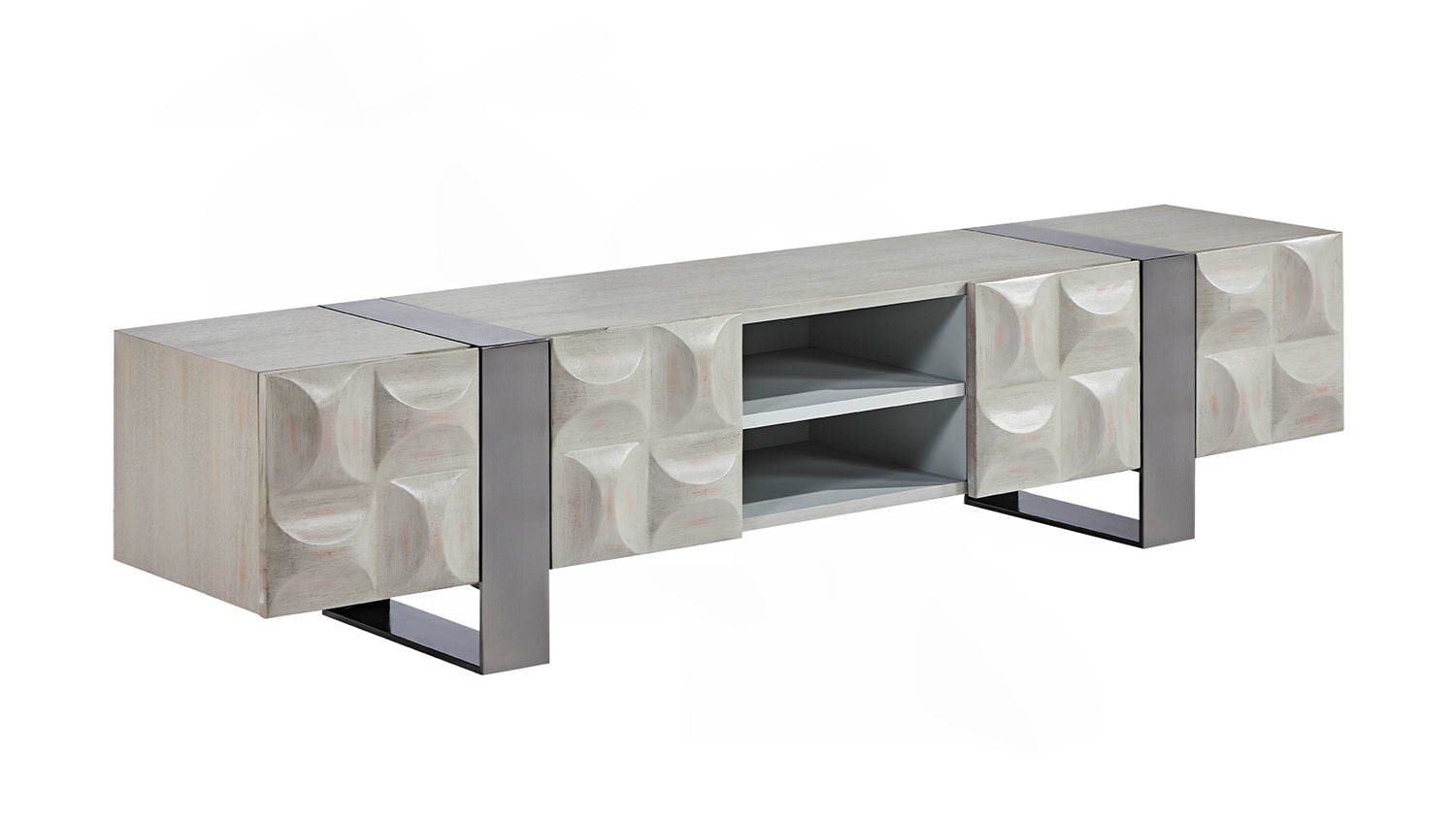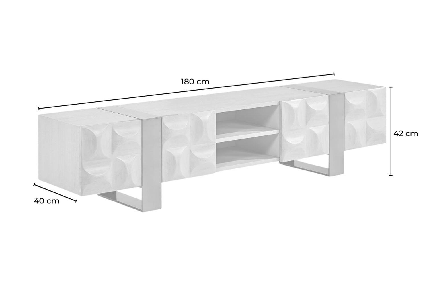 El Mueble bajo MARGO de KAWOLA impresiona por su elegante combinación de diseño moderno y funcionalidad práctica. Con su anchura de 180 cm, es el lugar ideal para su televisor. El cuerpo y las puertas están elegantemente chapados en madera de olmo gris de alta calidad, lo que confiere al mueble un aspecto lujoso. Las dos puertas y un total de cuatro compartimentos ofrecen un generoso espacio de almacenamiento, y las puertas pueden abrirse sin esfuerzo gracias al tirador empotrado de la parte superior. Las patas de patín de acero inoxidable cepillado de color plateado crean un aspecto moderno y atemporal a la vez que proporcionan estabilidad. El Aparador MARGO de KAWOLA se integra perfectamente en cualquier ambiente y es ideal para los amantes de los muebles originales y elegantes. Descubra la combinación perfecta de diseño y funcionalidad con el Mueble bajo MARGO.