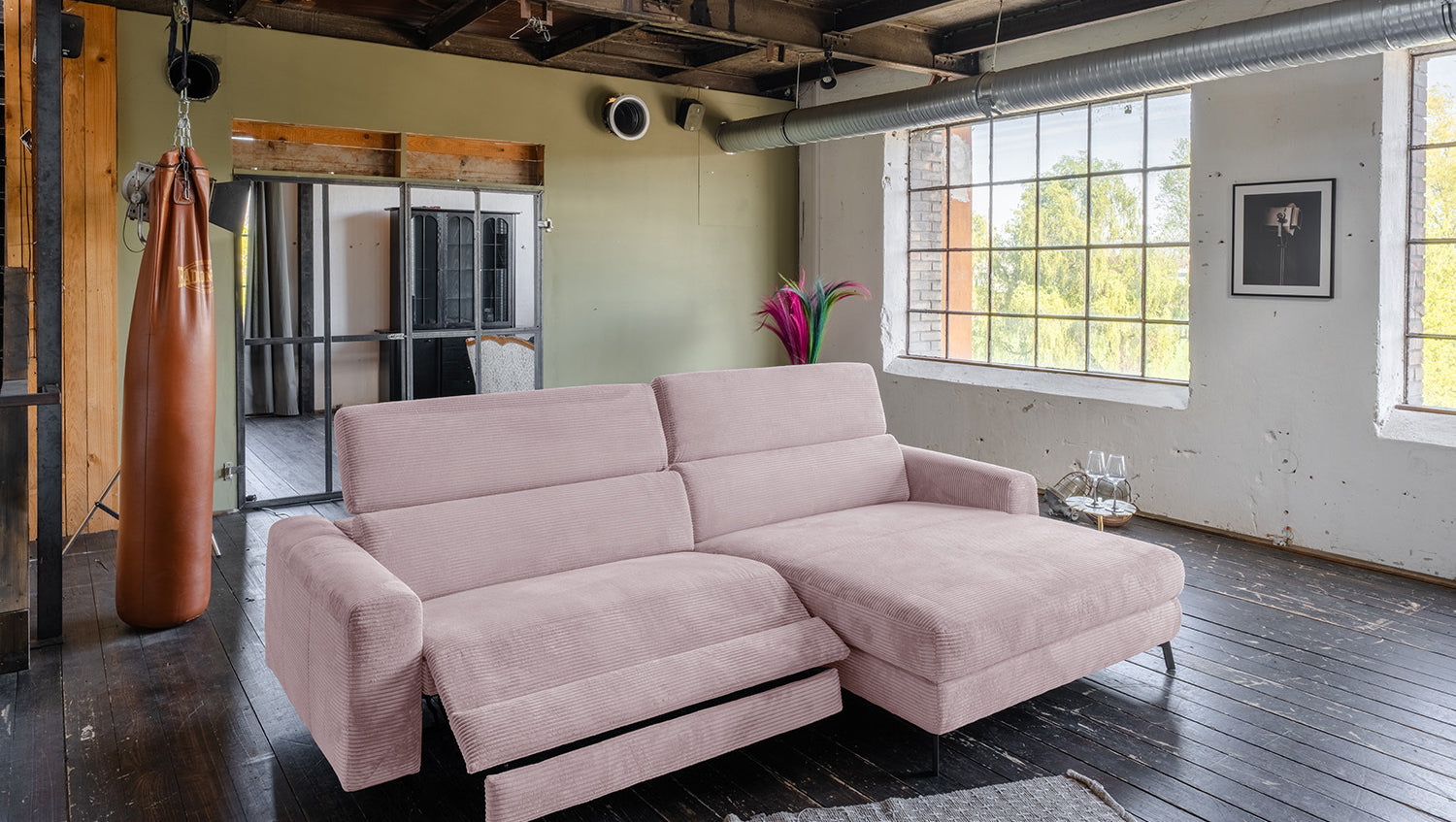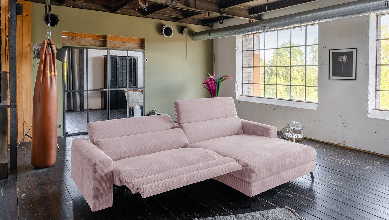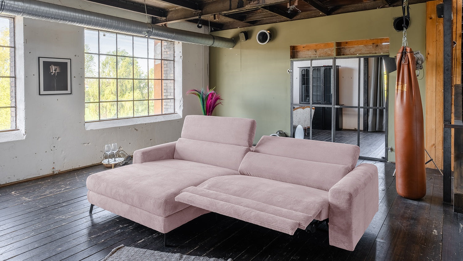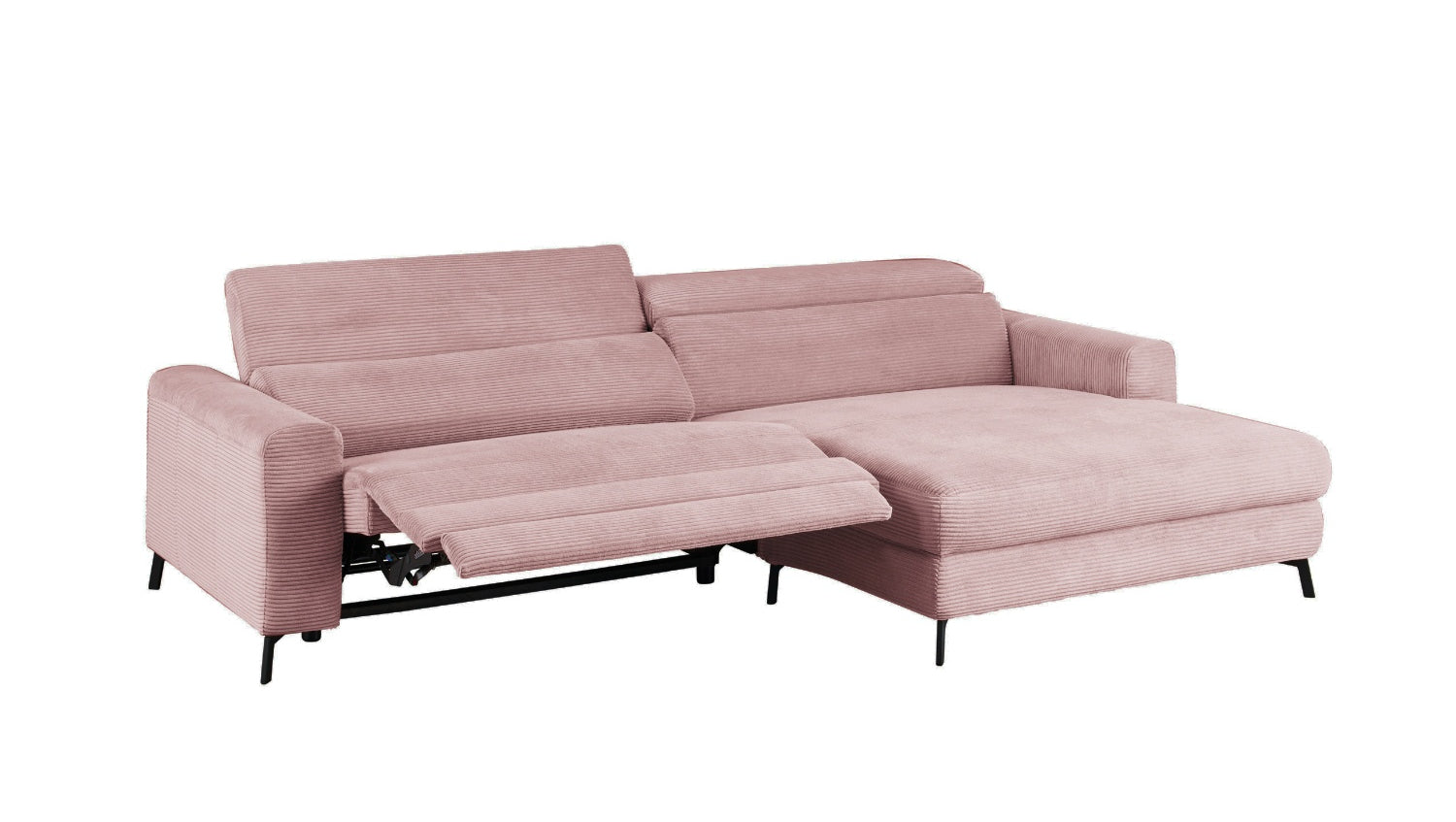 KAWOLA Sofá de esquina LAISKA función relax semi-motorizado Pana rosa