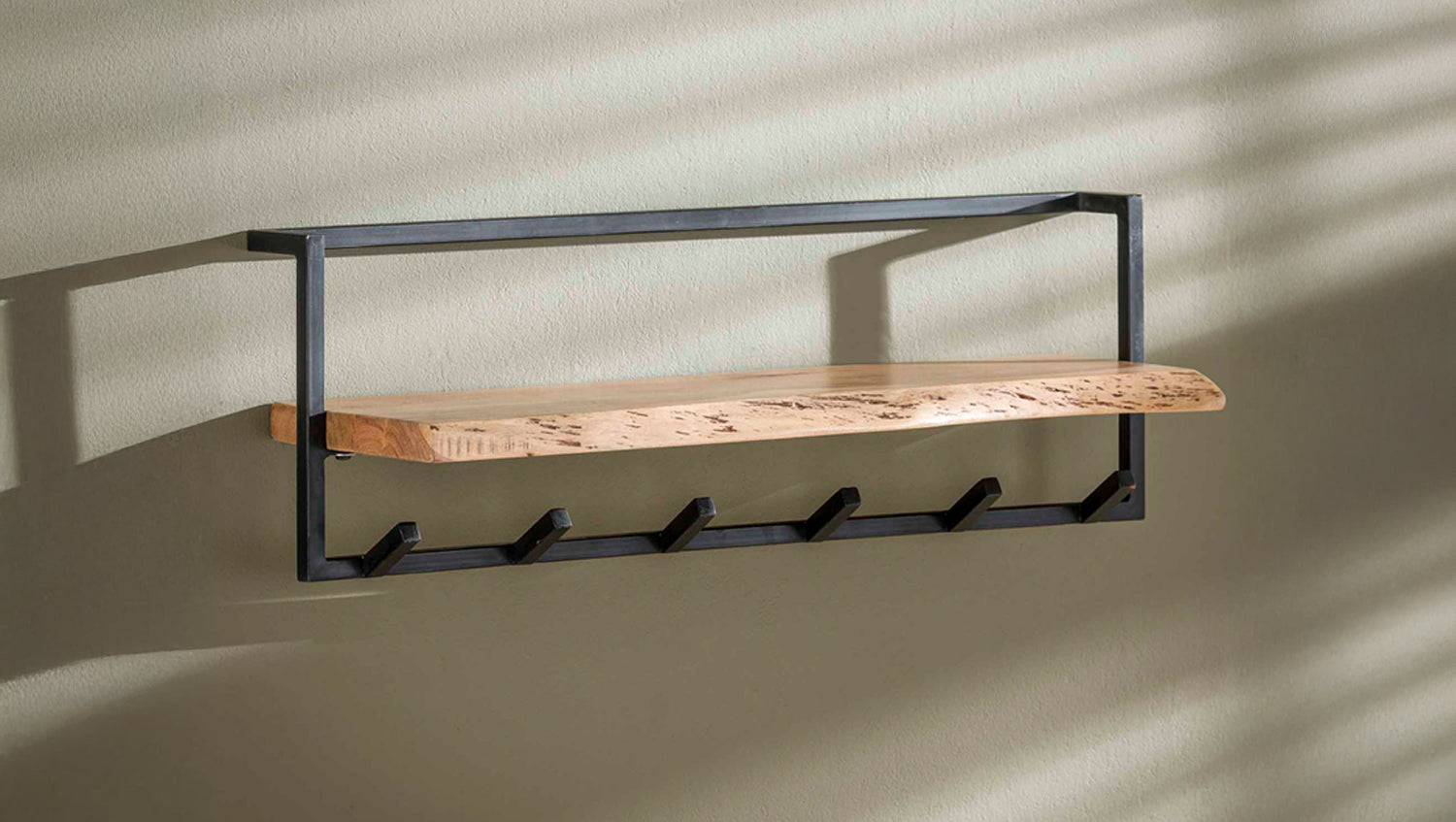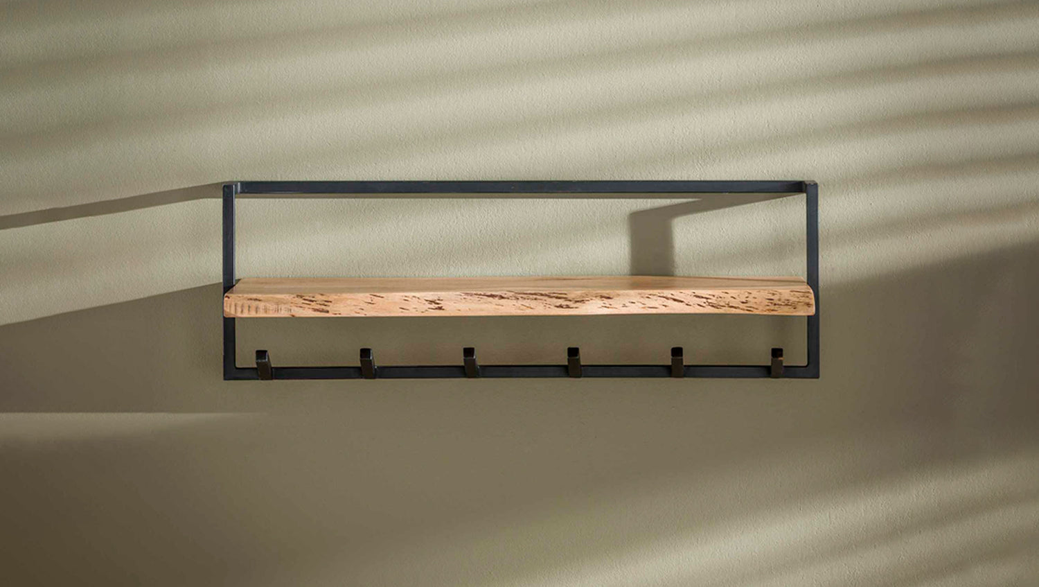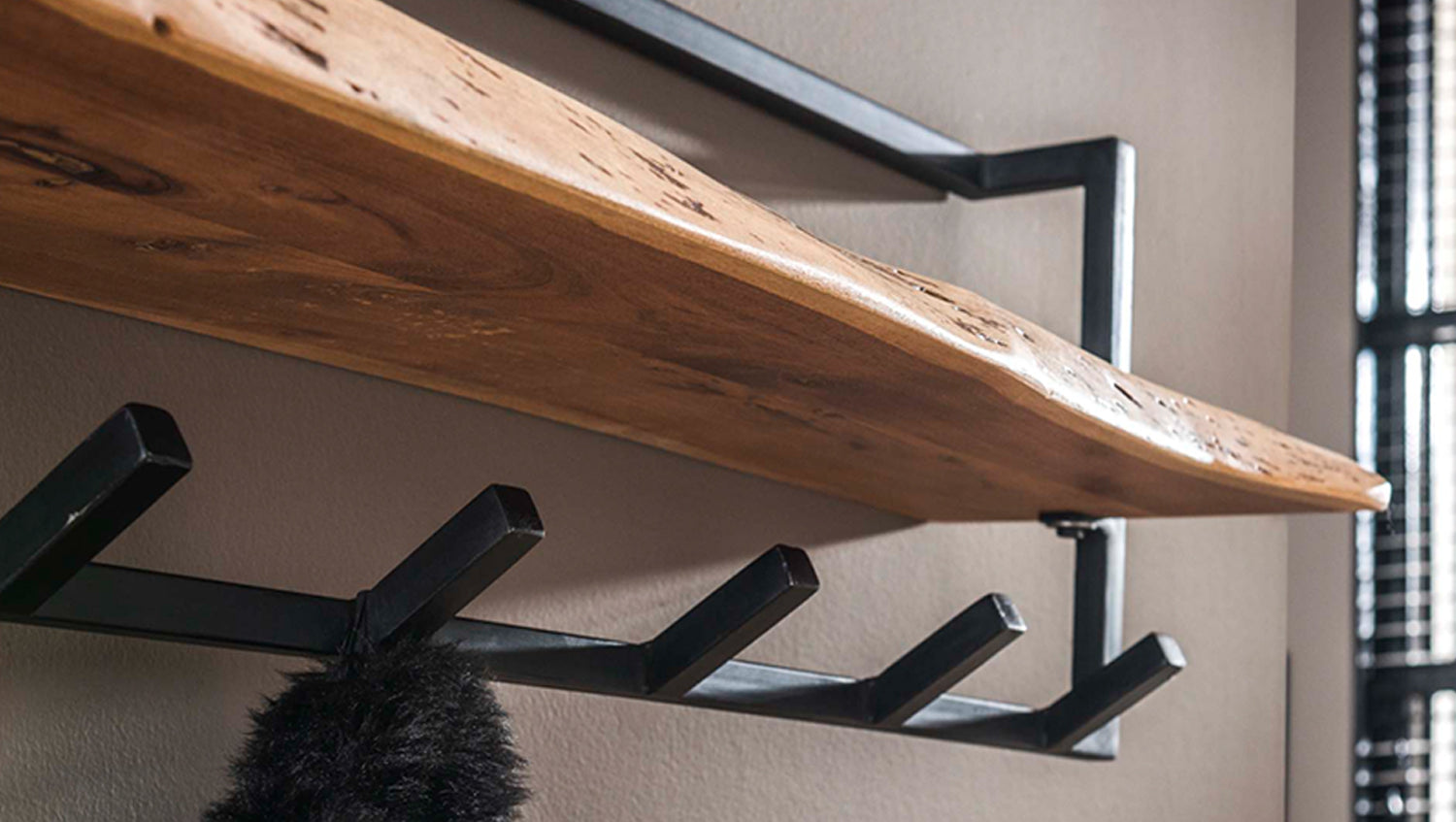 El perchero de pared NEREA de KAWOLA combina materiales de alta calidad con una sofisticada funcionalidad. El estante para sombreros de madera maciza de acacia impresiona por sus finas vetas y nudos naturales, que le confieren un carácter único. Fabricado con métodos tradicionales, crea un aspecto elegante en la pared. El estante para sombreros cuenta con 6 ganchos de metal negro pulido. Gracias a los dos ojales, el Guardarropa de 100 cm de ancho, 32 cm de alto y 25 cm de profundidad es fácil de instalar. NEREA es perfecto para pasillos, vestíbulos y zonas de entrada.