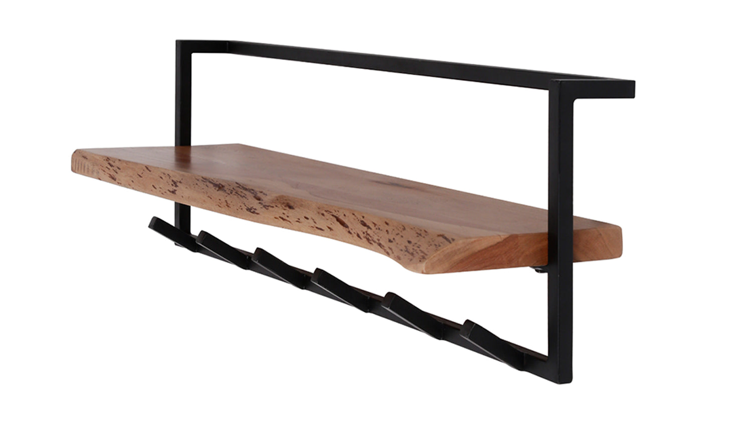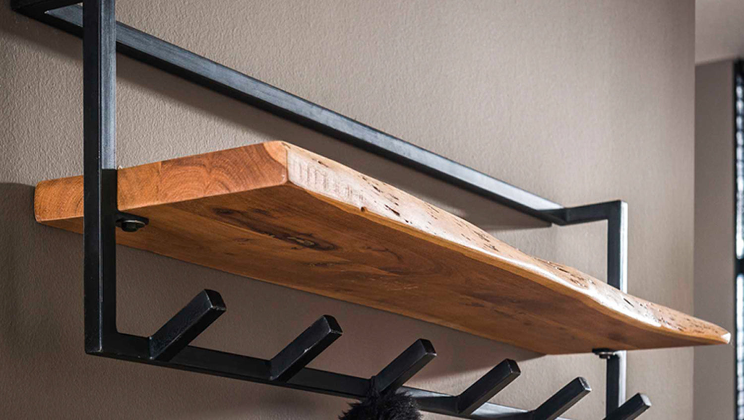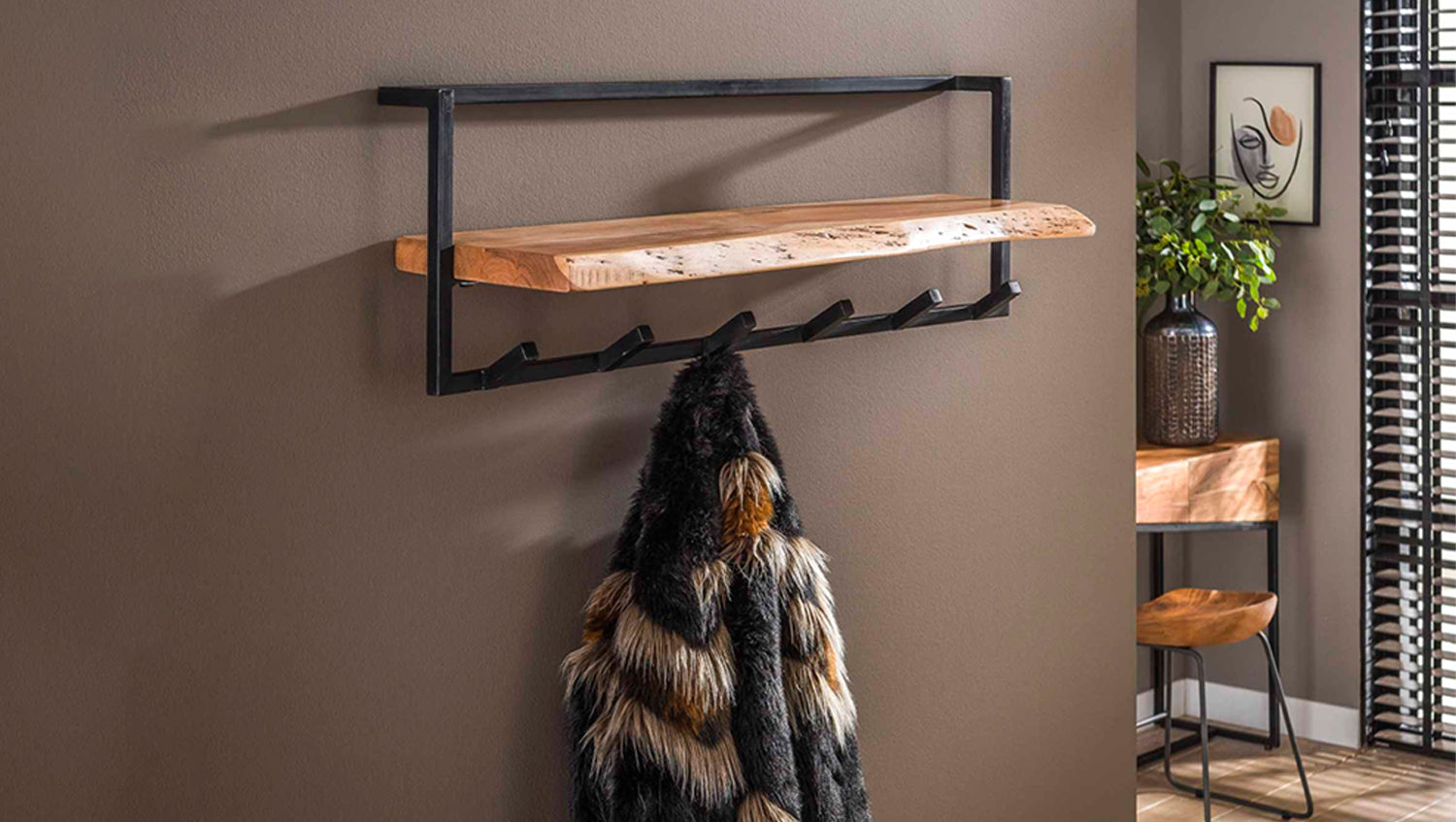 El perchero de pared NEREA de KAWOLA combina materiales de alta calidad con una sofisticada funcionalidad. El estante para sombreros de madera maciza de acacia impresiona por sus finas vetas y nudos naturales, que le confieren un carácter único. Fabricado con métodos tradicionales, crea un aspecto elegante en la pared. El estante para sombreros cuenta con 6 ganchos de metal negro pulido. Gracias a los dos ojales, el Guardarropa de 100 cm de ancho, 32 cm de alto y 25 cm de profundidad es fácil de instalar. NEREA es perfecto para pasillos, vestíbulos y zonas de entrada.