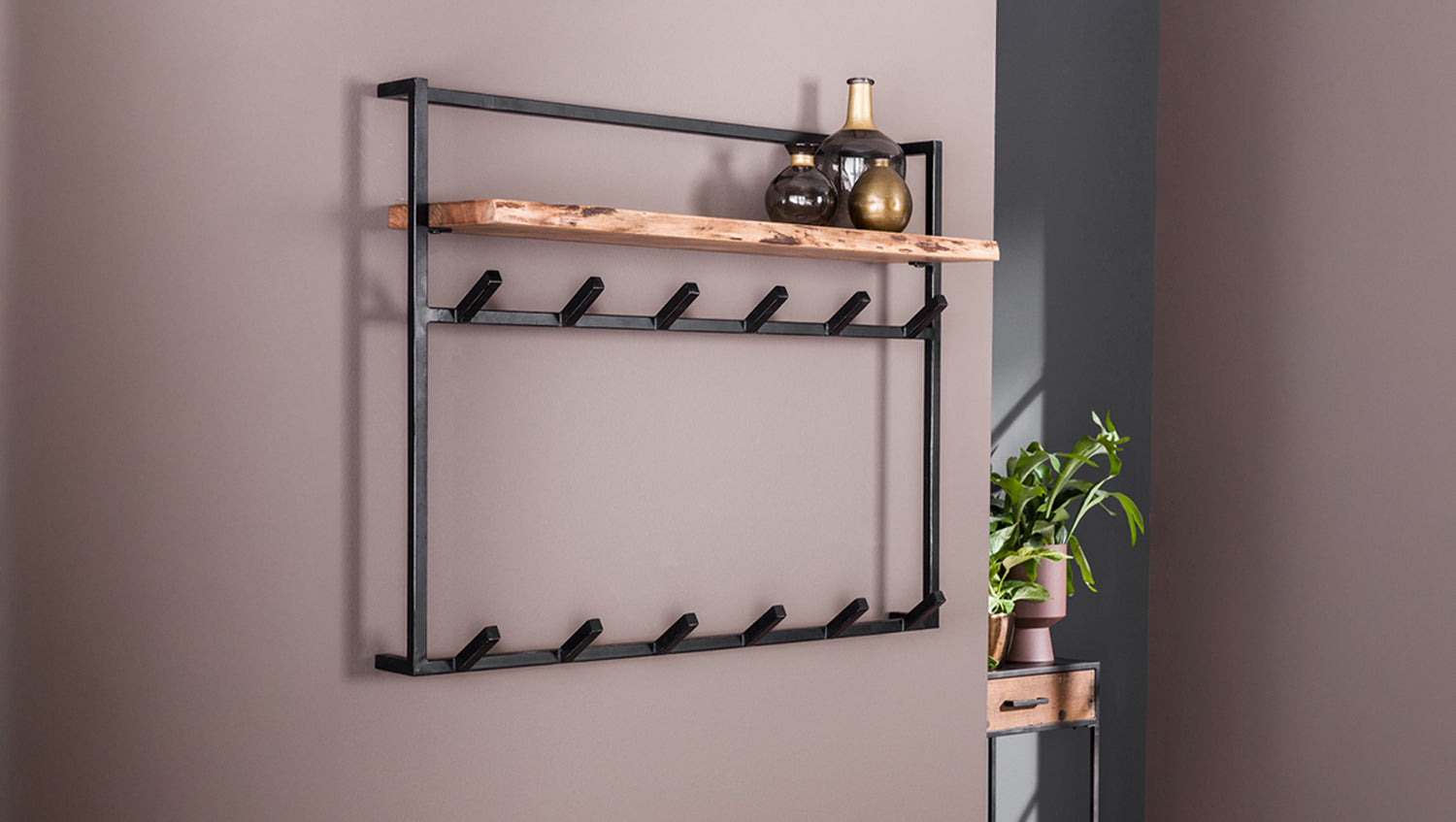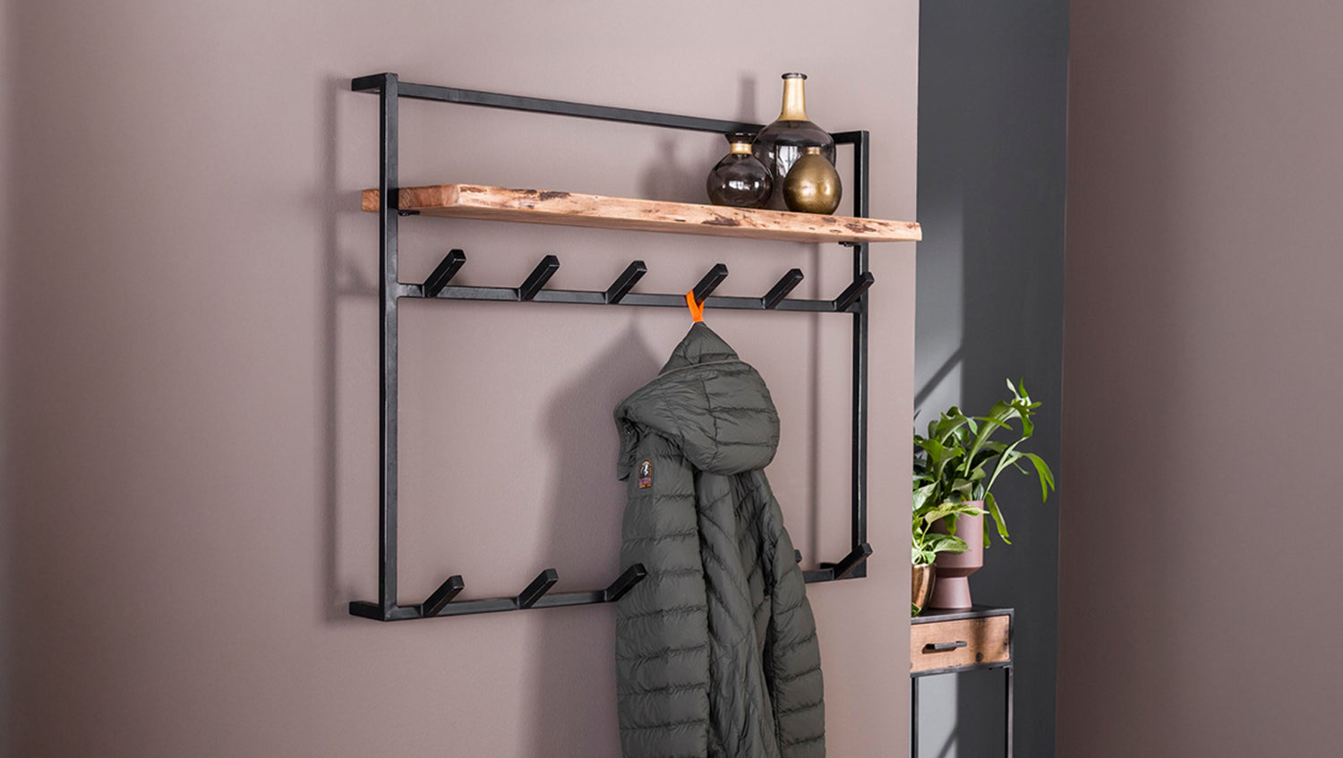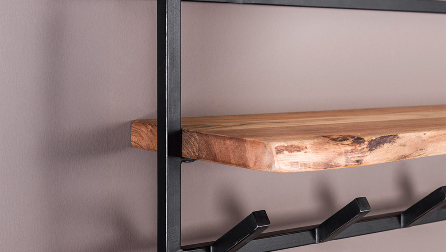 El perchero de pared RAICA de KAWOLA combina madera maciza de acacia de alta calidad con un diseño funcional. El estante para sombreros, cuidadosamente seleccionado, impresiona por sus finas vetas y nudos naturales, que le confieren un aspecto único. Acabado con métodos tradicionales, crea un aspecto elegante en la pared. Un total de 12 ganchos de metal pulido negro -6 en el estante y 6 en la parte inferior- ofrecen opciones versátiles para colgar chaquetas, bolsos o accesorios. Gracias a sus dos ojales, el Guardarropa de 100 cm de ancho, 80 cm de alto y 30 cm de profundidad es fácil de instalar. Perfecto para pasillos, vestíbulos o zonas de entrada, RAICA ofrece una solución elegante para una mayor organización.