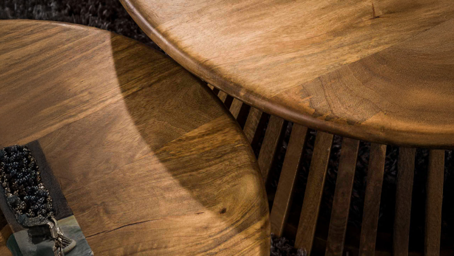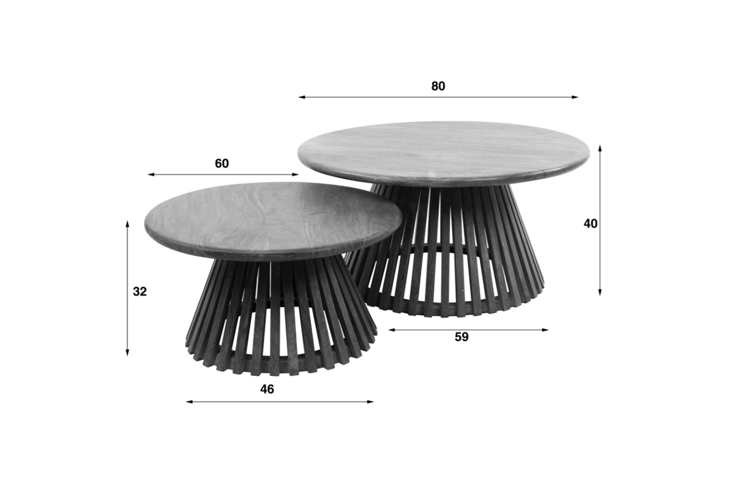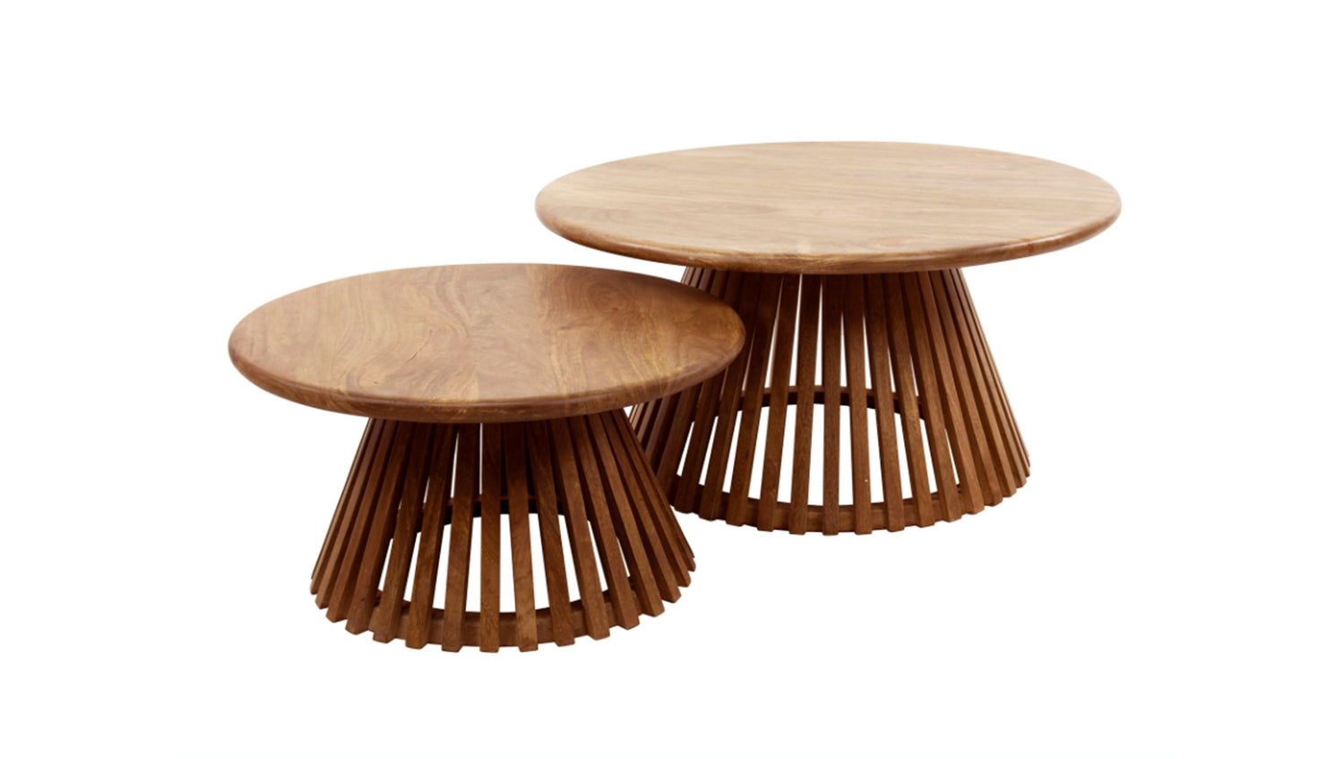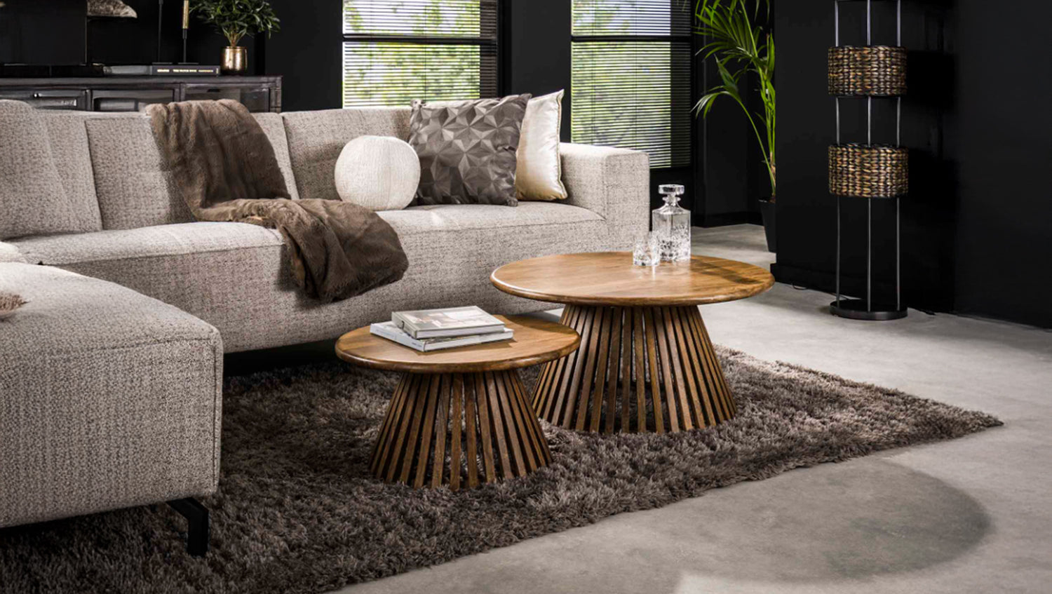 El juego de mesa de centro LANI de KAWOLA aúna naturaleza y diseño moderno en perfecto equilibrio. Está fabricado en madera de mango con superficie de color arena. Los tableros y los marcos de forma cónica de las dos mesas encajan a la perfección y crean un punto de atracción visual en su salón. Este conjunto es realmente imprescindible. Consta de dos mesas que pueden combinarse de forma flexible. La mesa más grande tiene un diámetro de 80 cm y una altura de 40 cm, mientras que la más pequeña tiene un diámetro de 60 cm y una altura de 32 cm. Los marcos tienen un diámetro de 59 cm y 46 cm en sus puntos más anchos. Ya sea en el salón, en la sala de estar o como una elegante estantería, el juego de mesas de centro LANI encaja en cualquier hogar y es toda una declaración de diseño.