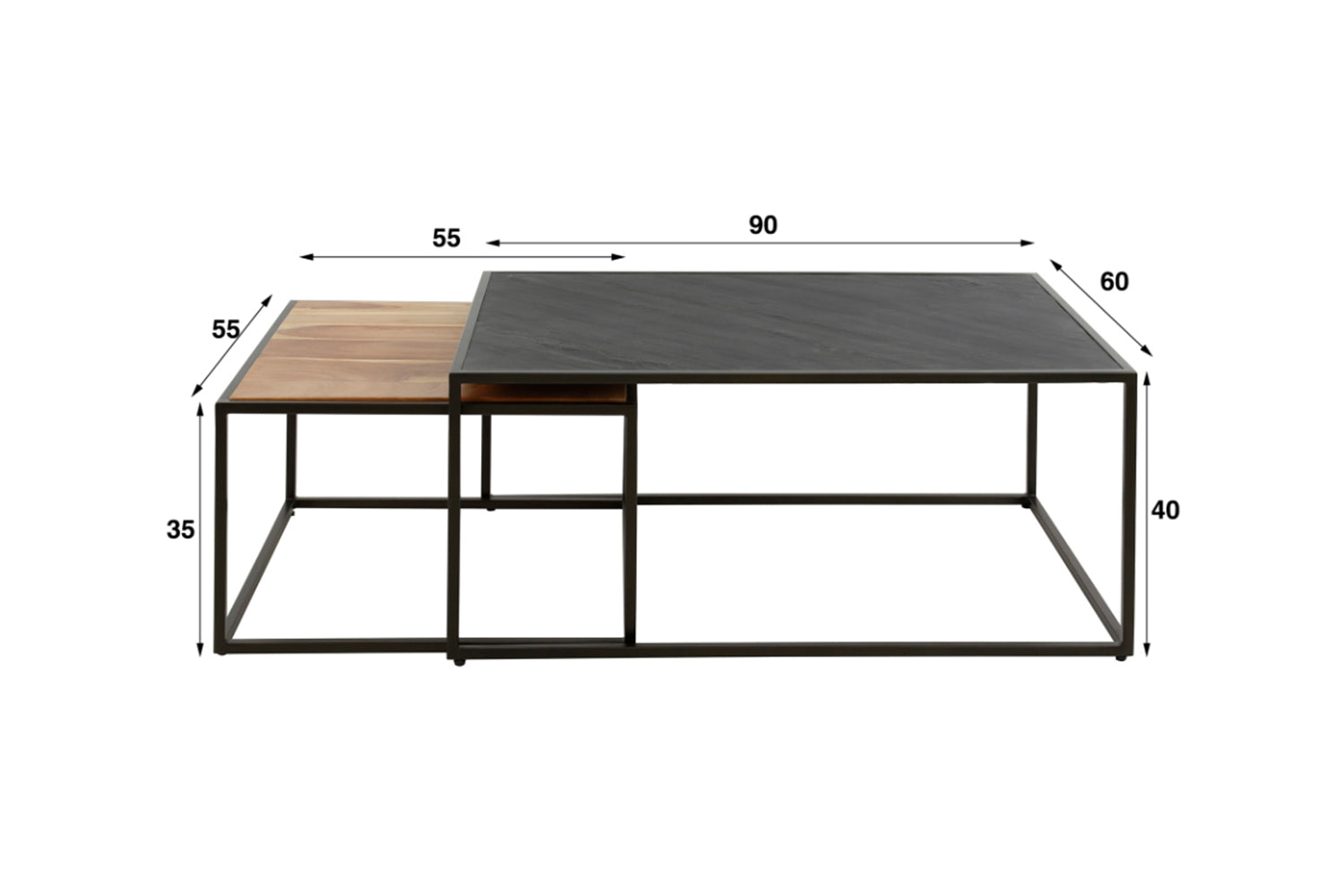 El juego de mesas de centro rectangulares NUKA de KAWOLA está fabricado en madera de acacia y pizarra con estructura de metal. Las mesas se pueden juntar a voluntad. El conjunto atemporal es adecuado para cualquier interior y consta de dos mesas. La mesa más grande tiene una superficie de 90 x 60 cm y una altura de 40 cm, mientras que la mesa más pequeña, de 55 x 55 cm y una altura de 35 cm, se puede deslizar perfectamente debajo. Ya sea en el salón, en la sala de estar o como elegante mueble de almacenaje, el juego de mesas de centro NUKA encaja en cualquier hogar y es toda una declaración de diseño.