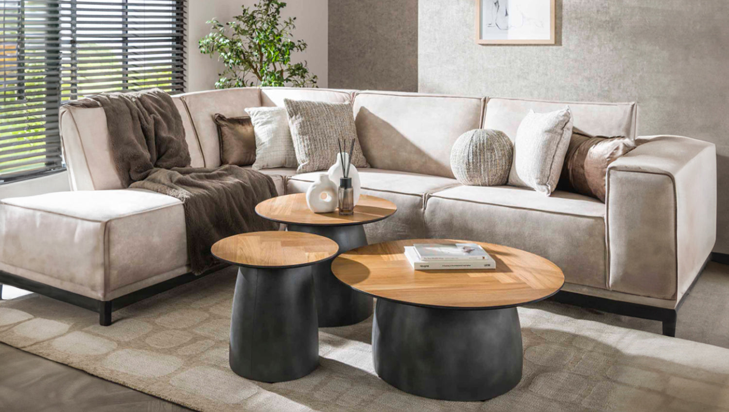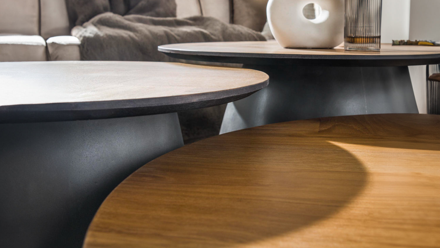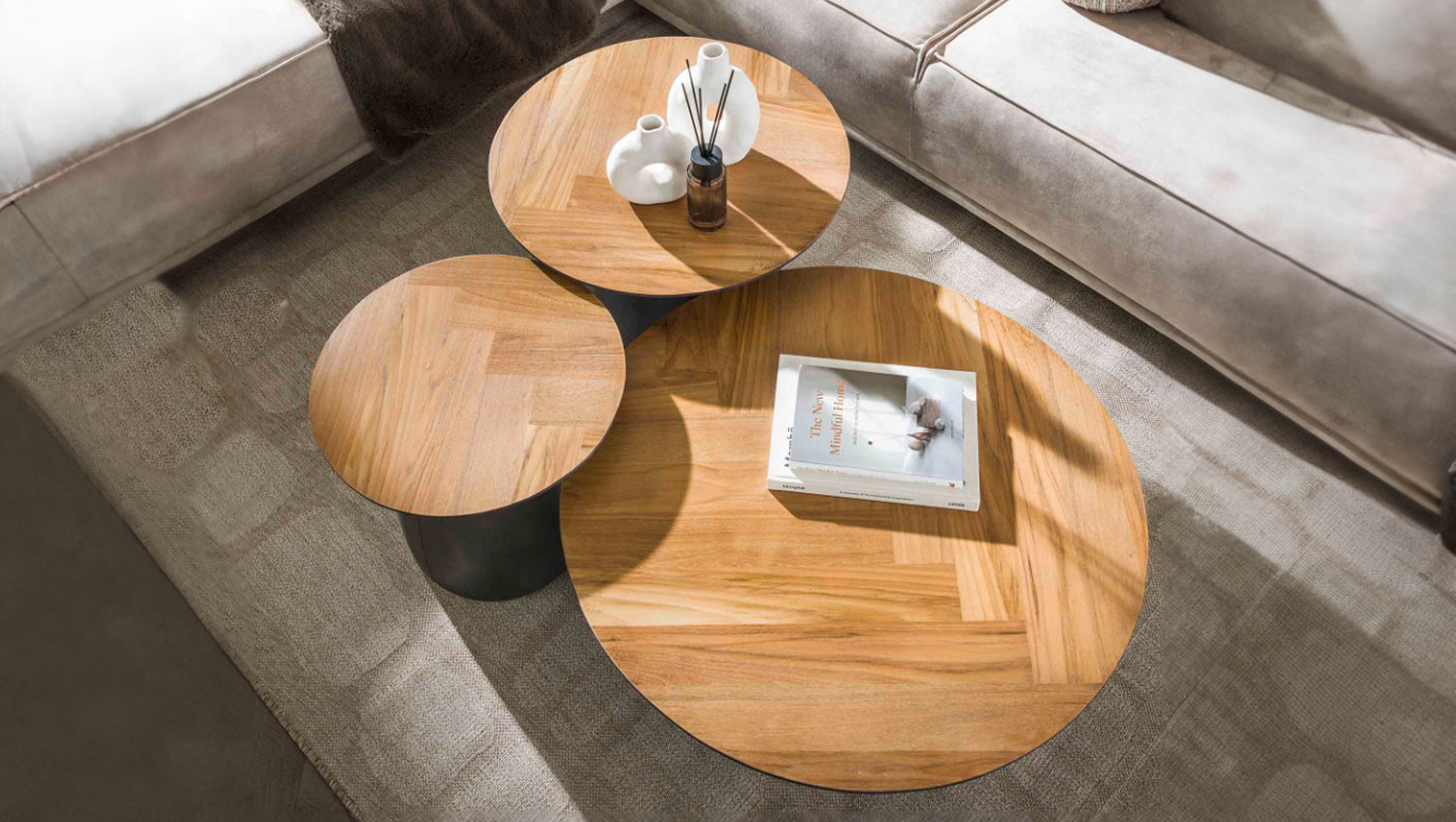 El conjunto de mesa de centro LUJAN de KAWOLA está fabricado en chapa de teca con patas de metal. El bonito tablero con diseño de espiga crea un aspecto cálido y natural, mientras que las estilizadas patas de metal añaden un toque moderno. El marco negro no sólo proporciona estabilidad, sino que también acentúa el elegante diseño de las mesas. Estas versátiles mesas son ideales para diversos usos, como un acogedor salón o un elegante espacio de trabajo. La combinación de materiales y colores hace que se integren fácilmente en diferentes estilos de interior, desde el industrial al minimalista. El conjunto consta de tres mesas. La mesa más grande tiene un diámetro de 80 cm y una altura de 35 cm. La mesa central tiene un diámetro de 60 cm y una altura de 45 cm. La mesa más pequeña tiene un diámetro de 45 cm y una altura de 41 cm. Ya sea moderno, rústico o clásico, el juego de mesa de centro LUJAN se adapta sin esfuerzo a cualquier estilo de decoración gracias a su aspecto atemporal. Ideal como centro de mesa con estilo en el salón y una auténtica atracción para los amantes de los muebles de alta calidad.