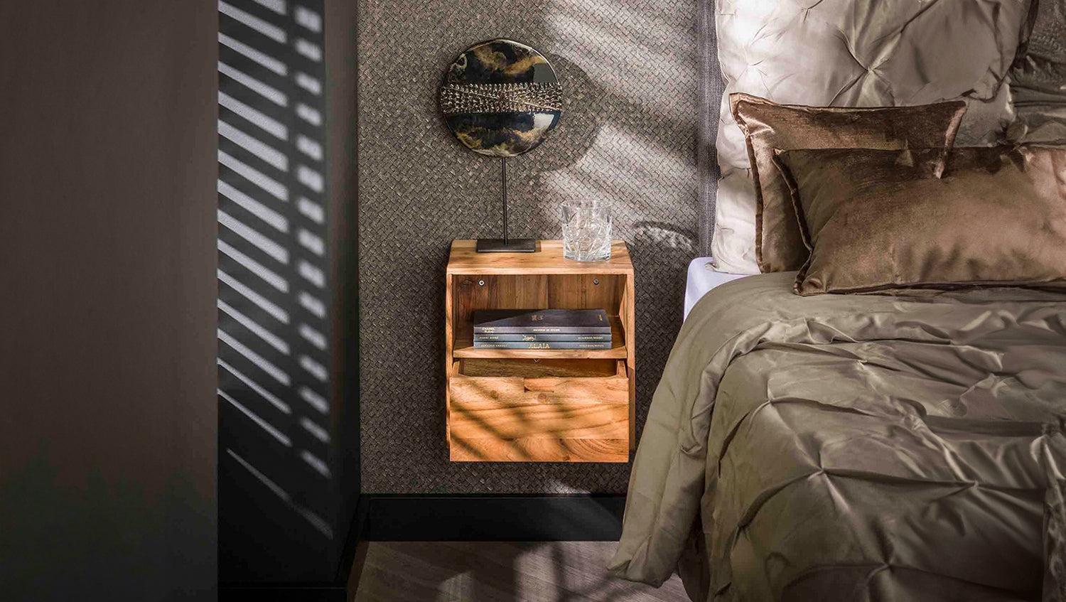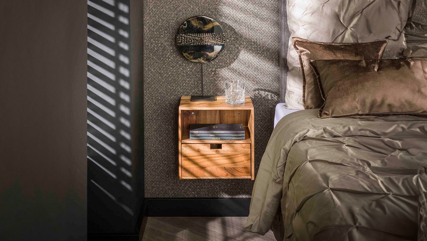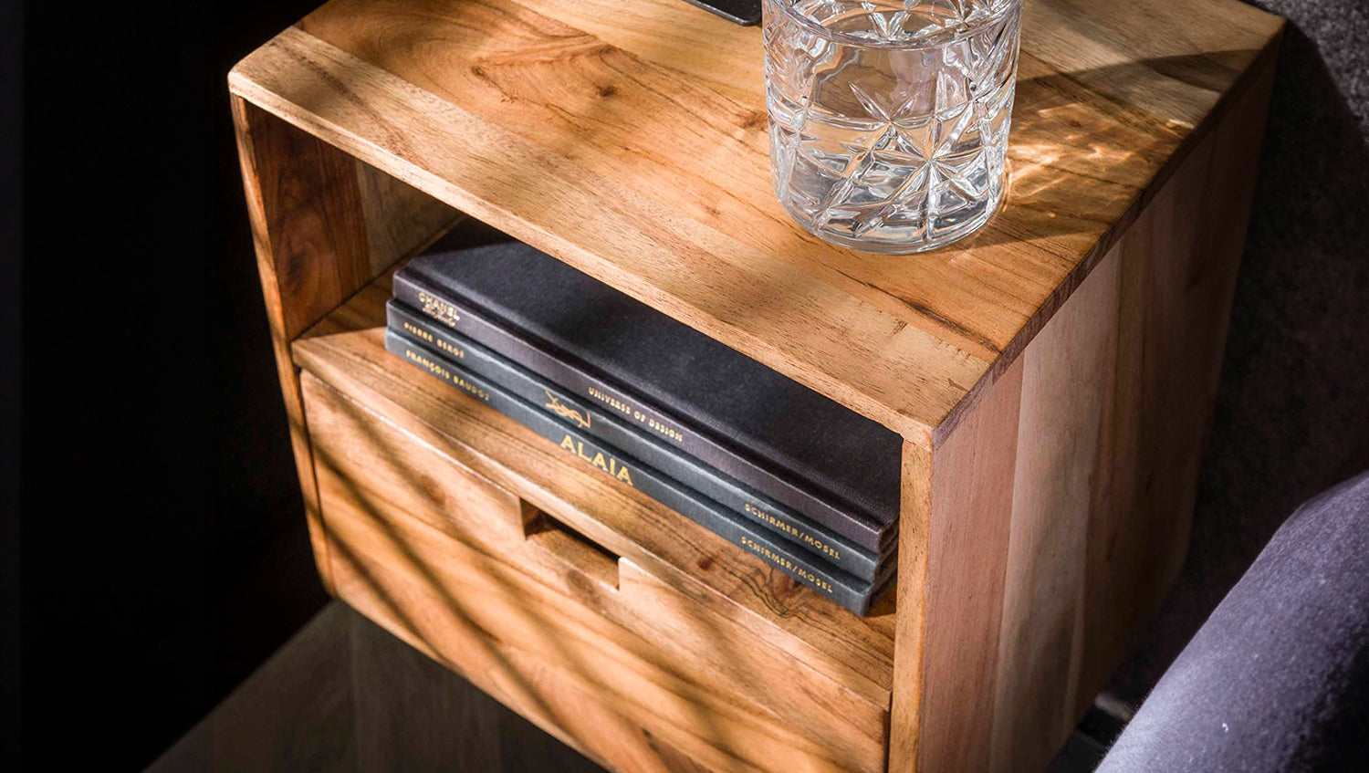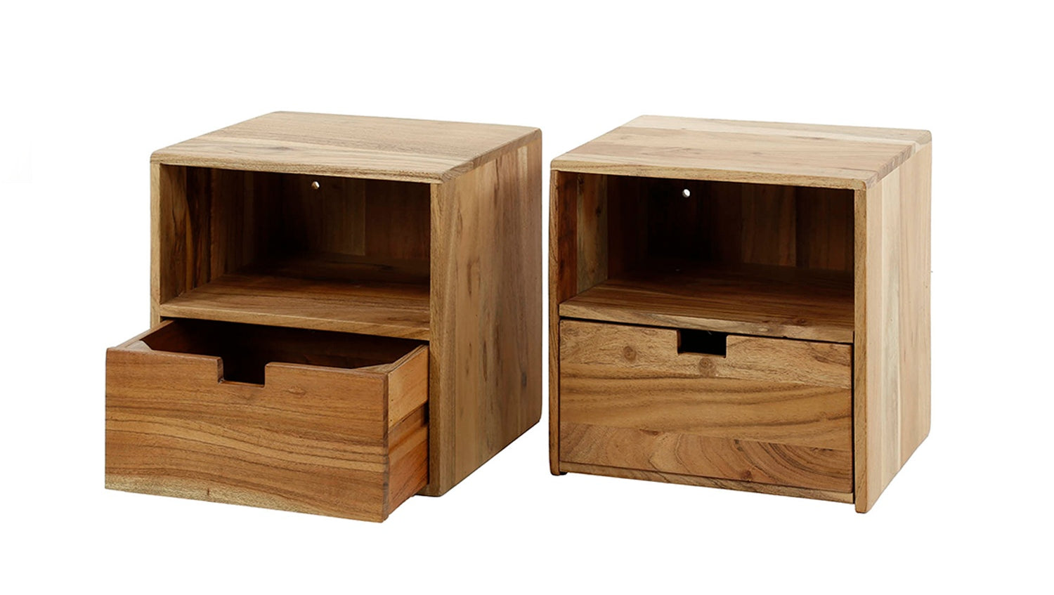El juego de mesitas de noche FATY de KAWOLA combina un diseño moderno con una elegancia natural. La mesilla está fabricada en madera de acacia y acabada con un lacado mate transparente. Tiene un cajón y un compartimento abierto. Se fija a la pared con dos tornillos, lo que le da un aspecto flotante. El conjunto se compone de dos mesillas de 30 cm de ancho, 25 cm de fondo y 30 cm de alto cada una. El juego de mesitas de noche FATY no sólo es funcional, sino que también atrae todas las miradas: perfecto para interiores modernos, minimalistas o rústicos. Ponga un toque de estilo con estas mesillas de noche de madera de acacia que ahorran espacio.