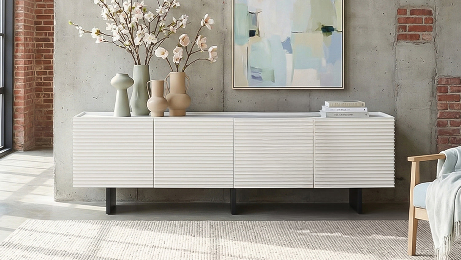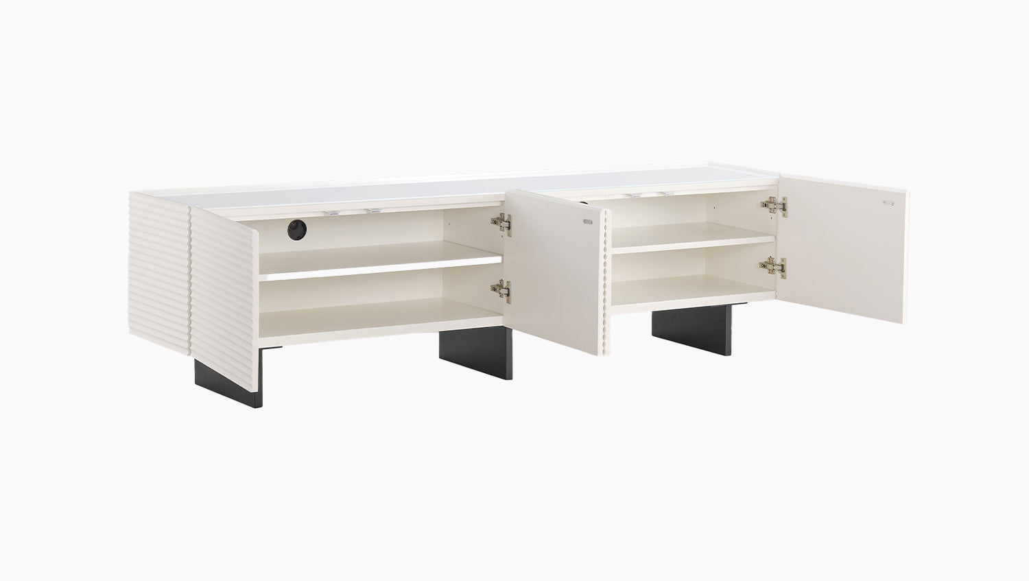 El mueble bajo LYNN de KAWOLA combina un diseño moderno con un toque de sofisticación funcional y se convierte en una base elegante para tu equipo audiovisual. El llamativo frente texturizado confiere al mueble para TV una profundidad especial y le da un aspecto expresivo, mientras que la elegante encimera de cristal aporta un toque de gran calidad. El cuerpo de madera descansa sobre una estructura metálica con recubrimiento en polvo, lo que garantiza la estabilidad y confiere al mueble un aspecto ligero y contemporáneo. Detrás de cuatro puertas, el mueble bajo ofrece cuatro amplios compartimentos que crean mucho espacio para receptores, consolas u otros accesorios. Los estantes se pueden colocar de forma flexible en tres alturas diferentes, cada una con una separación de 7 cm, para que pueda adaptar el espacio interior de forma óptima a sus necesidades. Gracias al mecanismo «Finger-Pull», las puertas se abren cómodamente sin tiradores visibles, mientras que las bisagras de cierre suave permiten un cierre suave y silencioso. De este modo, el aparador para TV LYNN combina un diseño llamativo con una funcionalidad bien pensada.