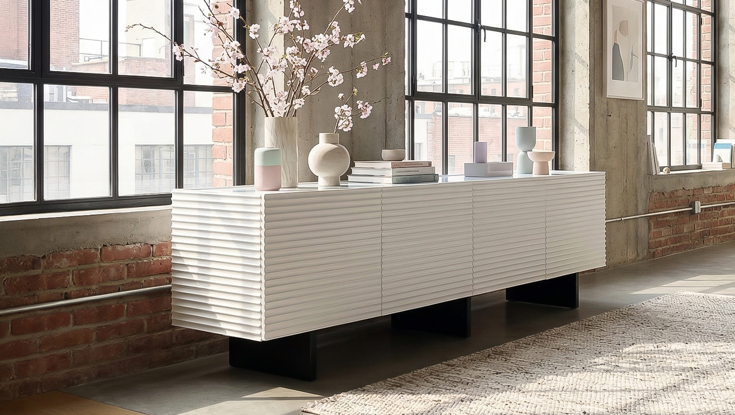 • Mueble bajo moderno con un llamativo frente texturizado y una elegante encimera de cristal