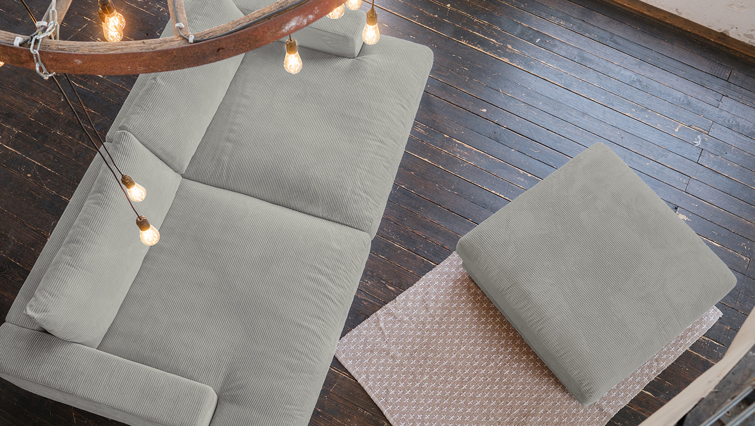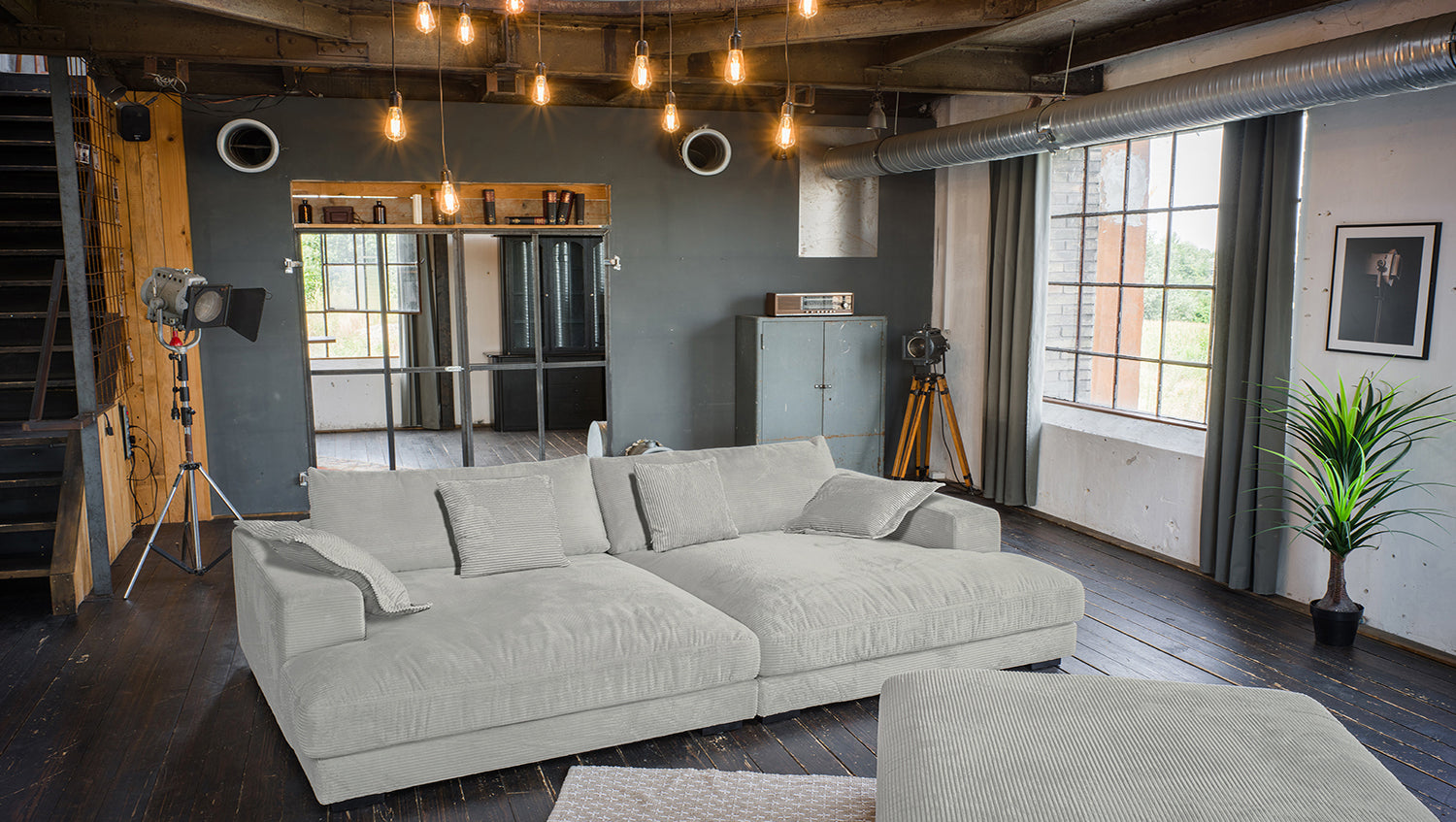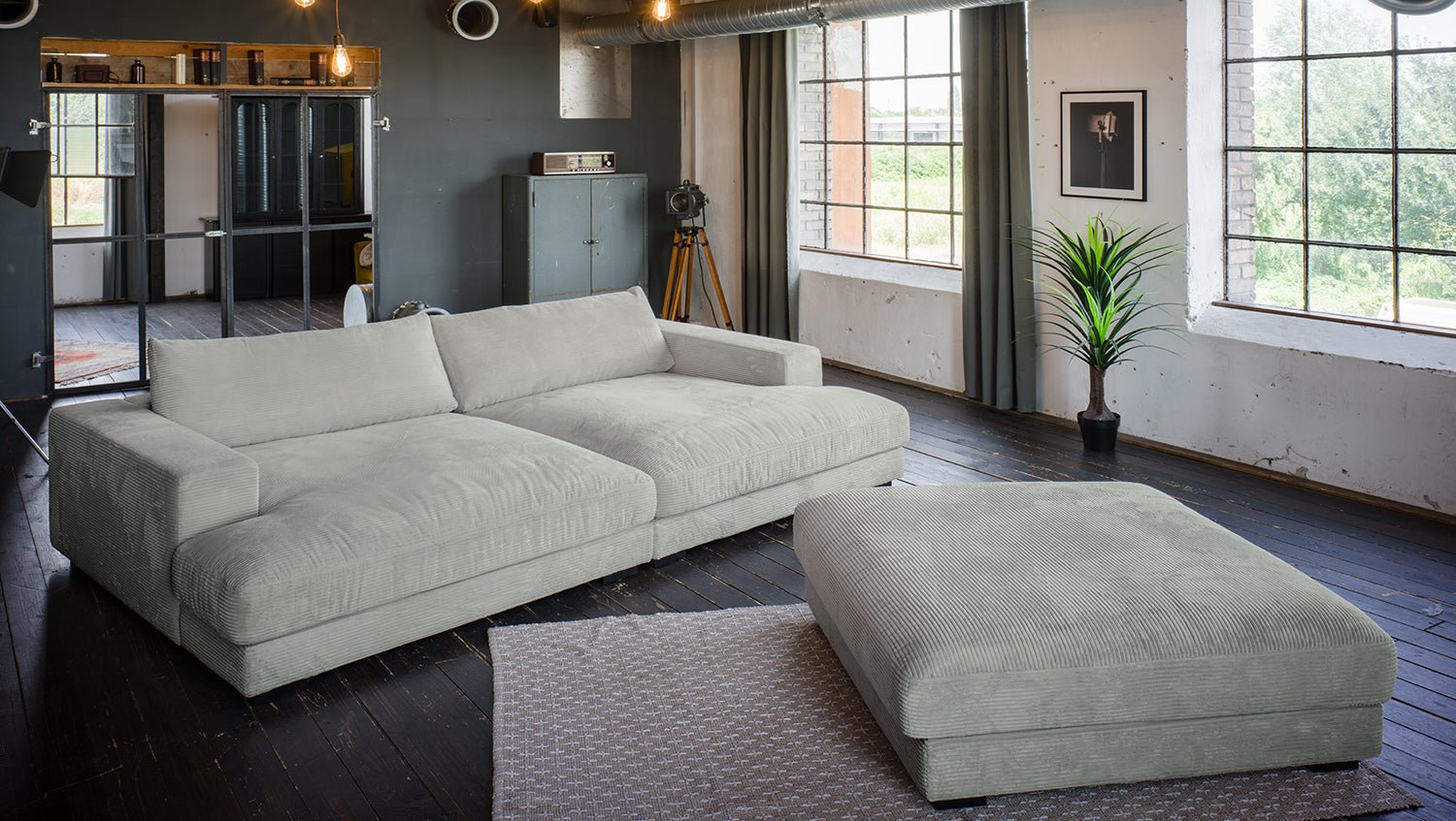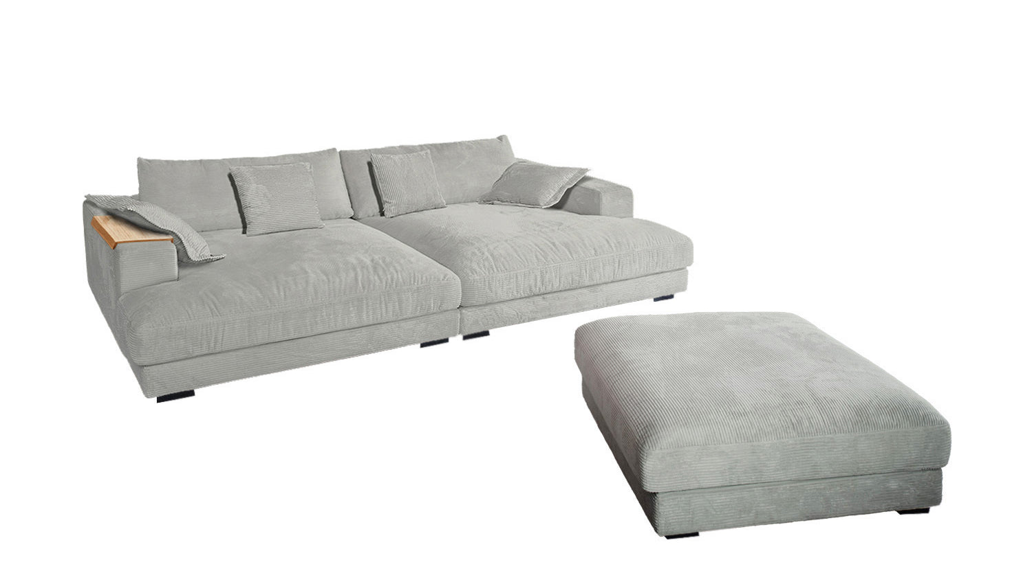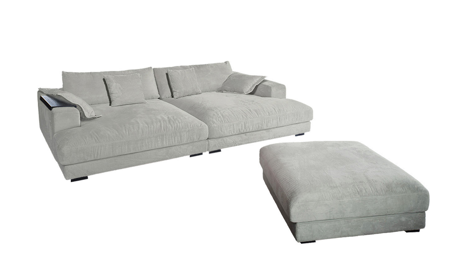 KAWOLA Sofá extra ancho MADELINE Pana gris claro con Puf y 4 cojines decorativos