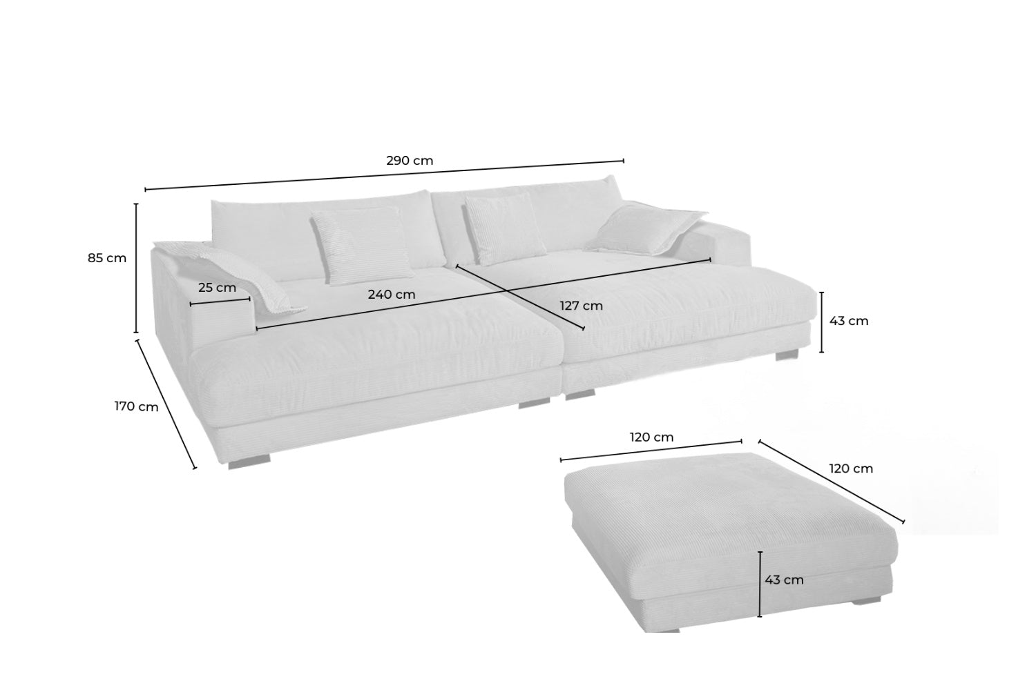 El Sofá extra ancho MADELINE de KAWOLA impresiona por su extraordinaria comodidad de asiento, que se consigue gracias a su tapizado extremadamente desenfadado y que invita a quedarse y relajarse. Sus inusuales dimensiones y su forma moderna y urbana confieren al sofá un aspecto inconfundible y ofrecen mucho espacio para pasar veladas acogedoras. Con su diseño atemporal, se integra a la perfección en cualquier ambiente y también destaca de pie en la habitación. Este exclusivo conjunto incluye nuestro sofá más vendido junto con la popular otomana grande MADELINE y 4 elegantes cojines decorativos. De este modo, su nuevo sofá favorito se convierte en una pequeña zona de estar y hace que las horas que pase en él sean aún más cómodas. Si quiere dar a su salón un toque extraordinario, ¡nuestro Sofá extra ancho MADELINE es sin duda la elección correcta para usted!